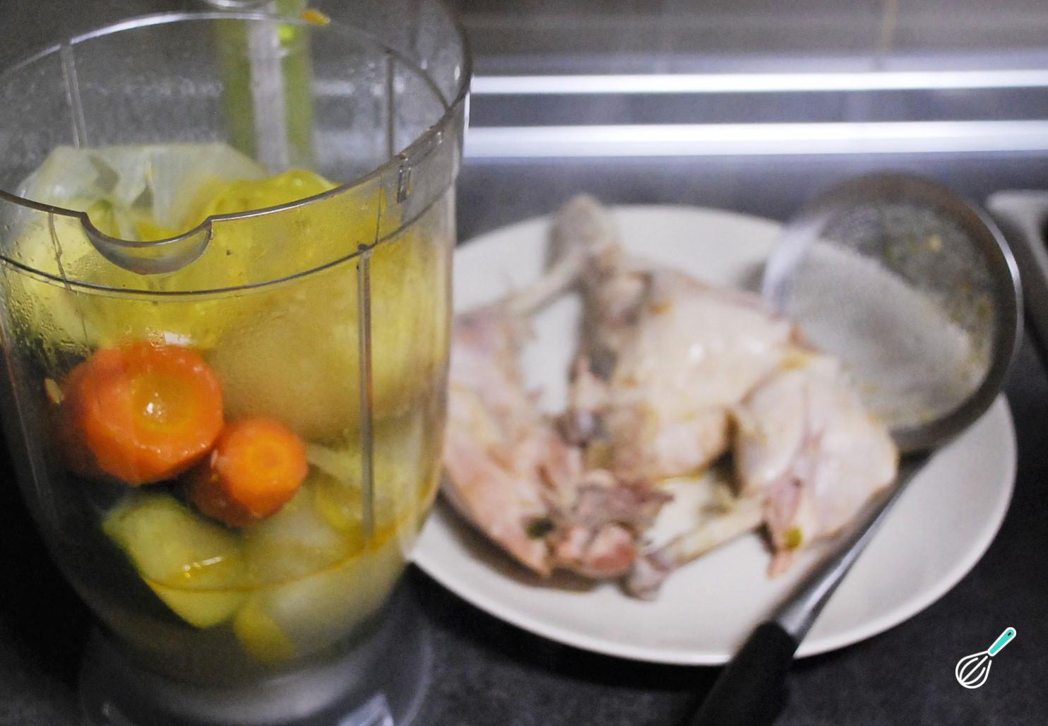 Com a ajuda de uma escumadeira, remova todos os vegetais e coloque-os diretamente no liquidificador ou processador de alimentos que usa para triturar a comida. Pode descartar a acelga porque seu sabor é ligeiramente amargo. Retire também o frango e reserve separadamente. Triture os legumes até obter uma consistência homogênea.