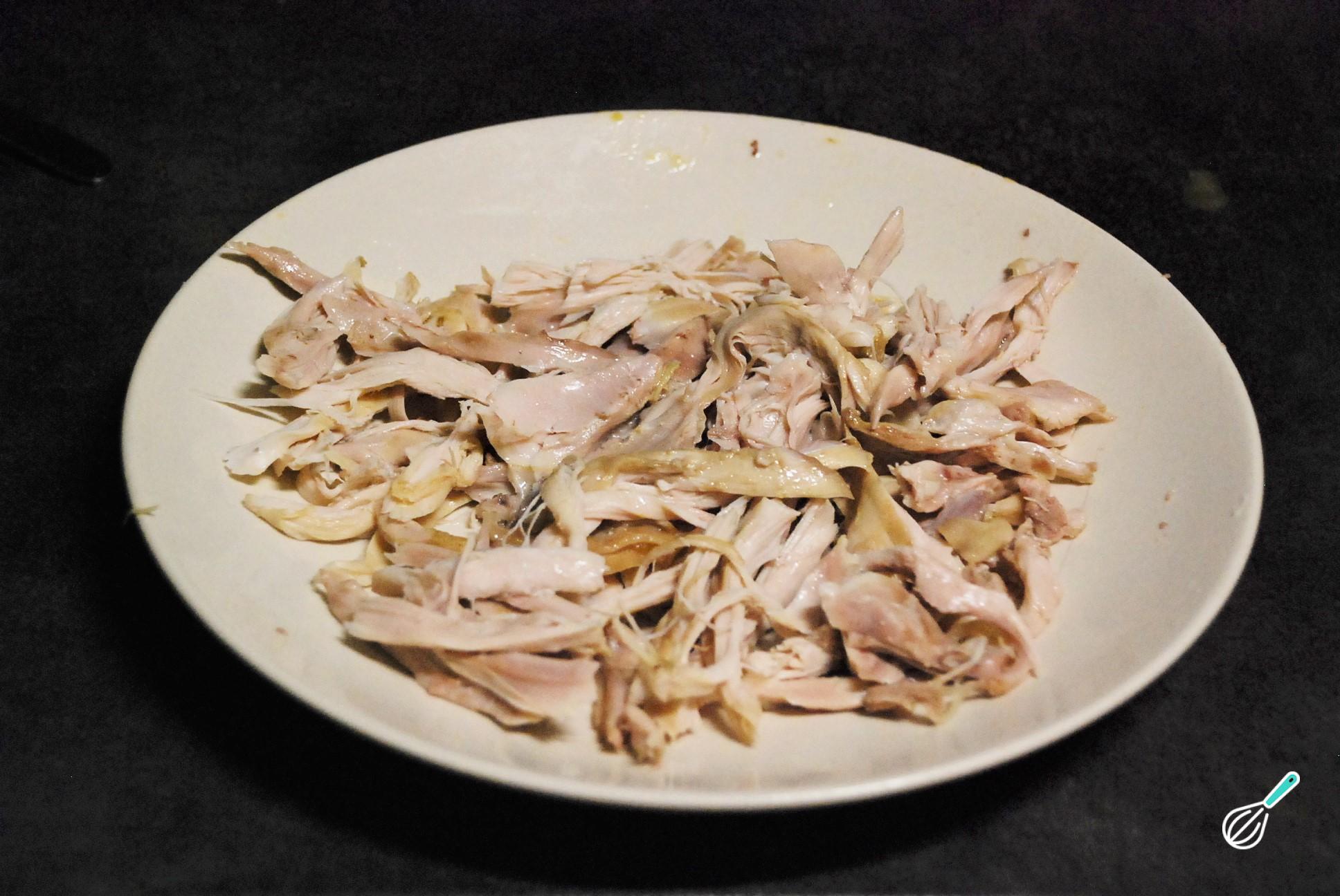 Enquanto isso, quando as coxas já tiverem esfriado ligeiramente, desfie o frango, tirando toda a carne do osso.