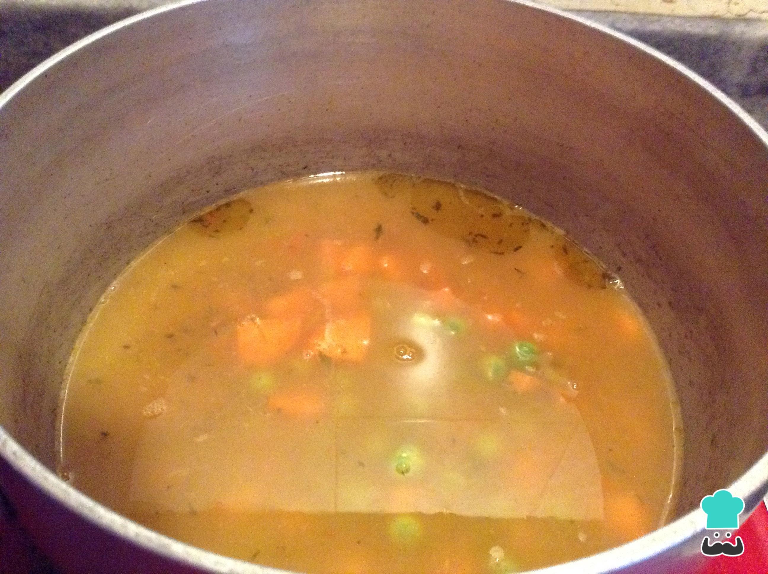 Leve uma panela funda ao fogo médio com o caldo de carne. Quando estiver fervendo, adicione a cenoura cortada em pedaços e as ervilhas, deixe cozinhar por 10-15 minutos.
