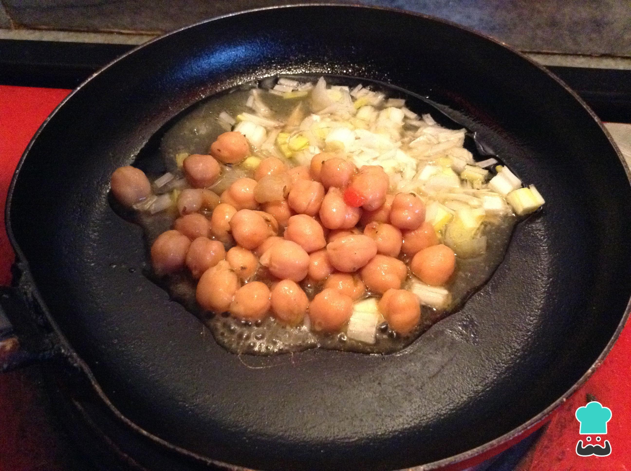 Adicione à panela o alho-poró e o grão e cozinhe por mais 5 minutos. Desligue o fogo.