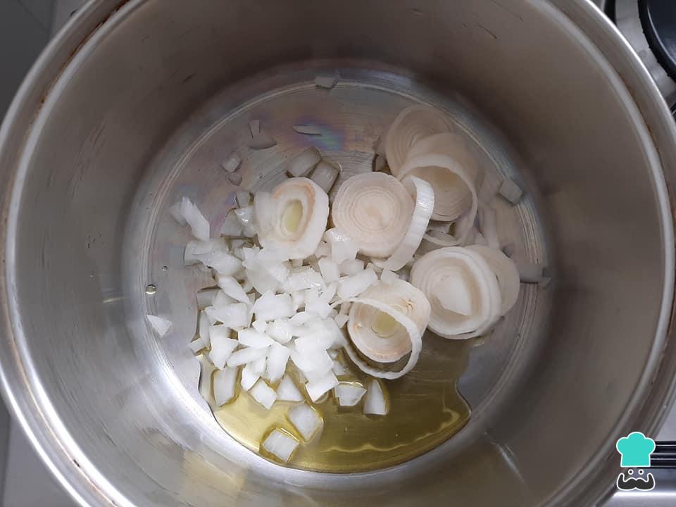 Numa panela média aqueça o azeite de oliva e refogue a cebola e o alho poró até dourarem levemente.