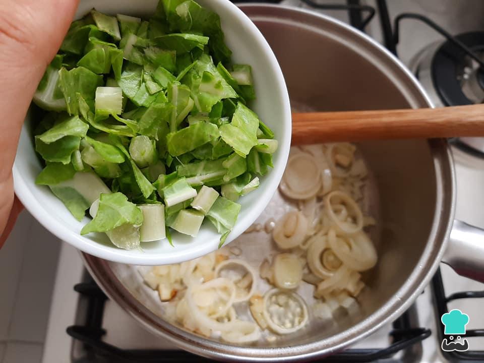 Adicione os talos de couve e refogue mais um pouco.
