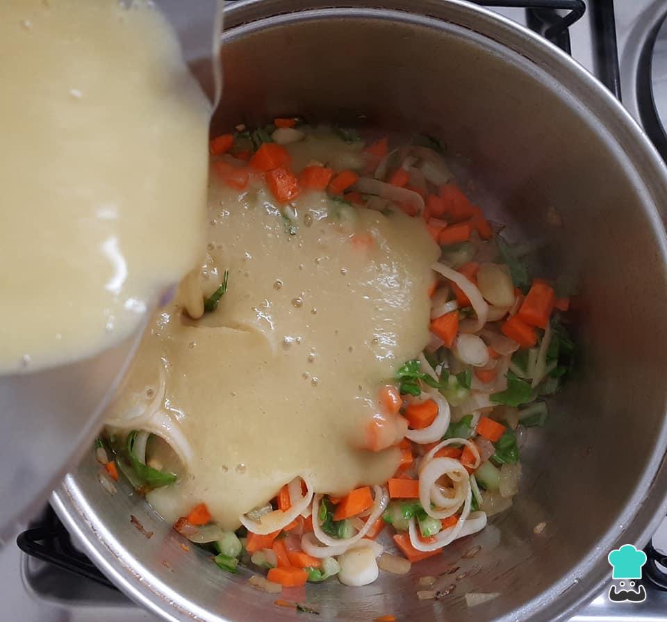 Acrescente a cenoura em cubinhos e adicione o creme de inhame ao refogado.