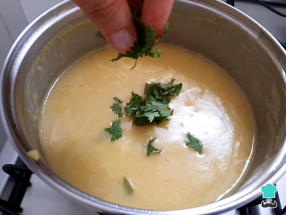 Deixe cozinhar em fogo baixo até a cenoura amolecer. Desligue o fogo e acrescente o coentro picado.