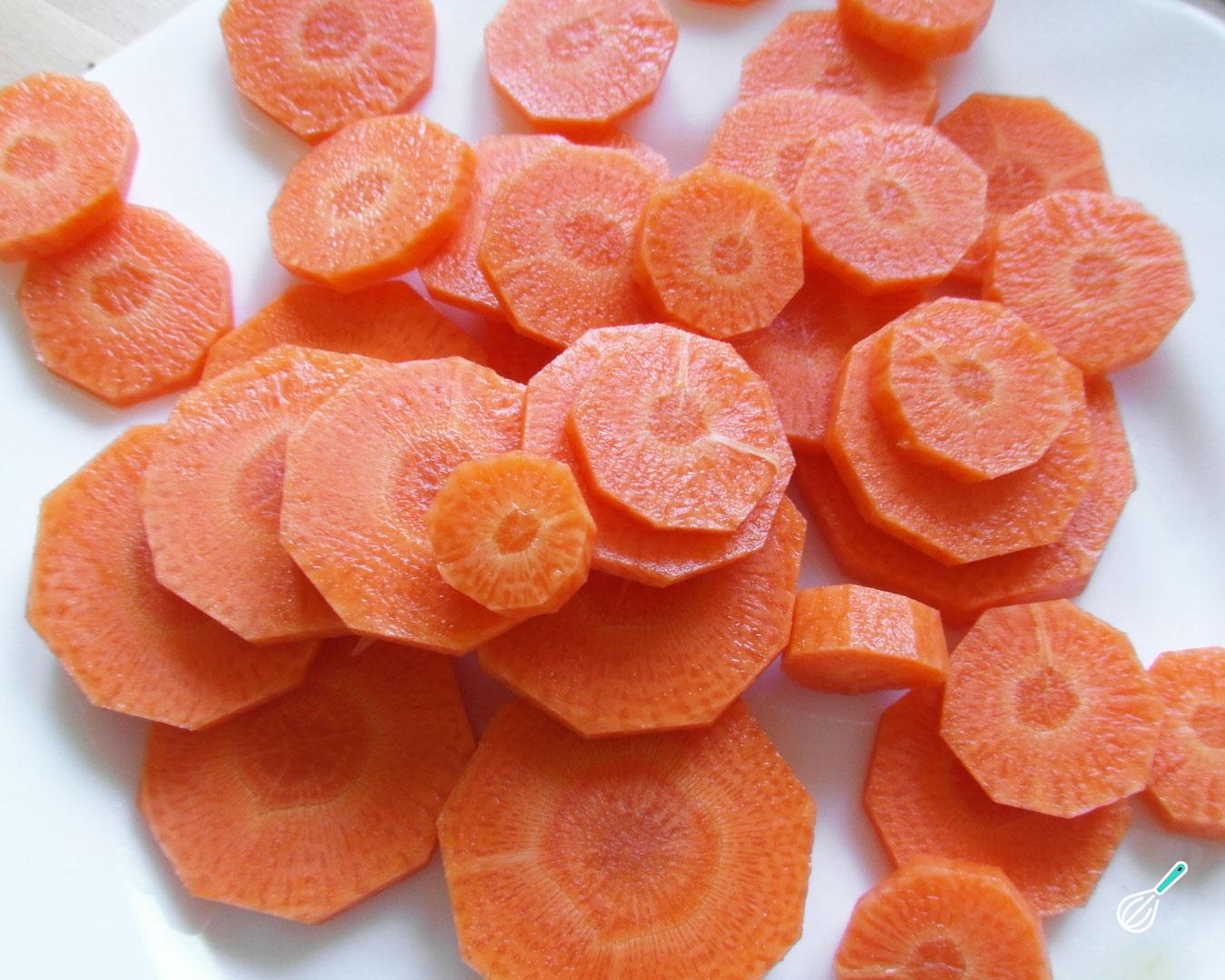 Enquanto isso prepare os restantes ingredientes: descasque as cenouras e corte em rodelas, corte também em rodelas o alho poró, descasque os dentes de alho e amasse eles.