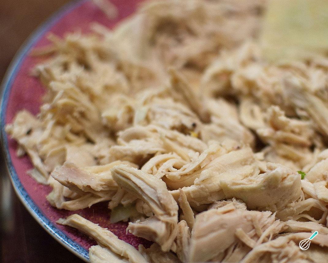 Após esse tempo retire a peça de frango e desfie. Se observar que o frango ainda está cru, devolva ele na panela e deixe cozinhar por mais 10 minutos. Prove a sopa e acerte o sabor com sal e pimenta do reino a gosto.