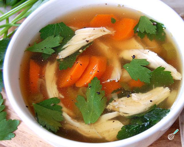 Sirva este caldo de legumes e frango em seguida, com o frango desfiado e algumas folhinhas de salsinha fresca. Ele é ótimo para tomar na hora do jantar, como última refeição do dia. Bom apetite e diga nos comentários o que você achou!