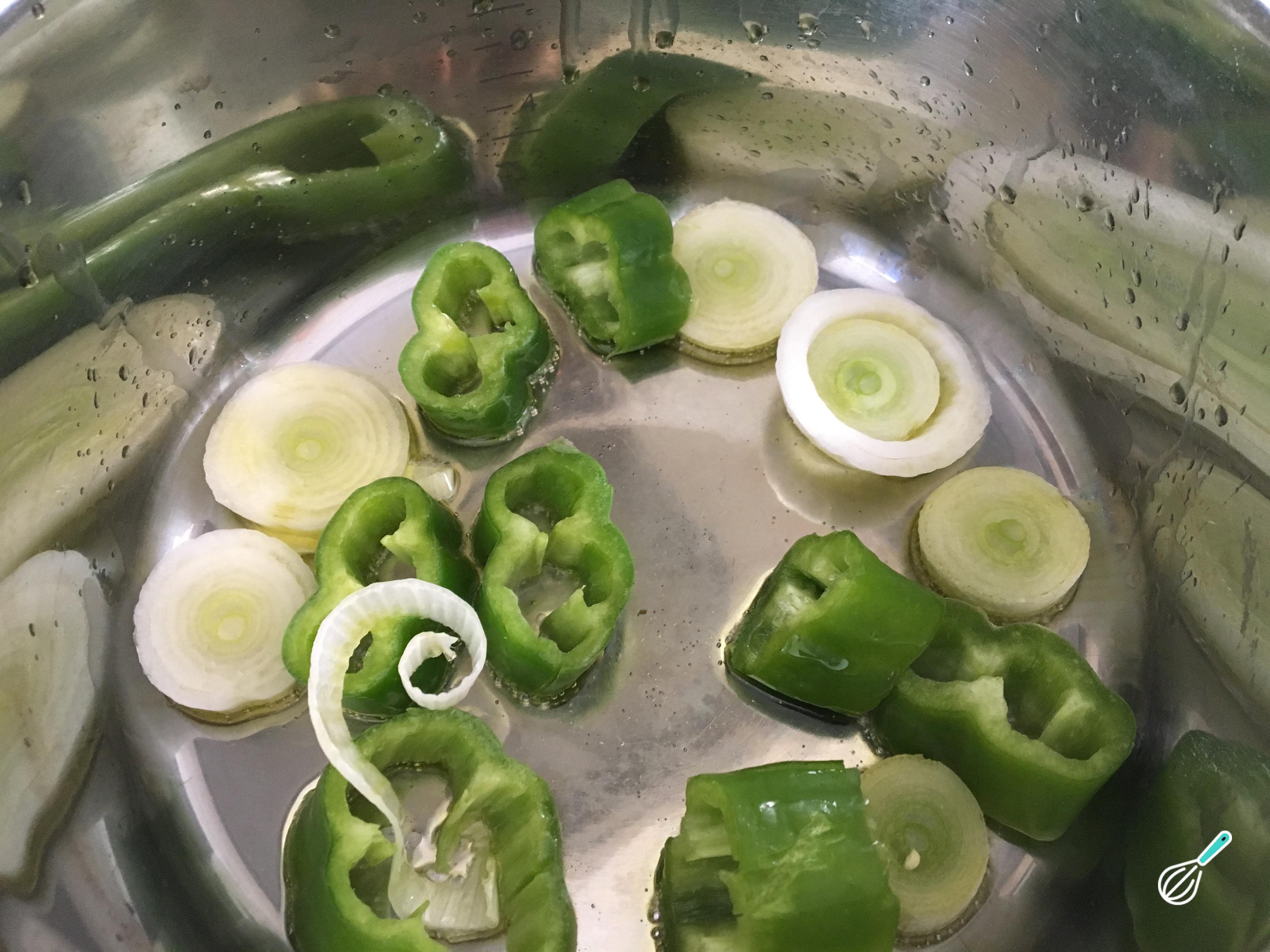 Corte a cebola e o pimentão em rodelas e cozinhe em uma panela com o azeite por 3-4 minutos, até ficarem macios.