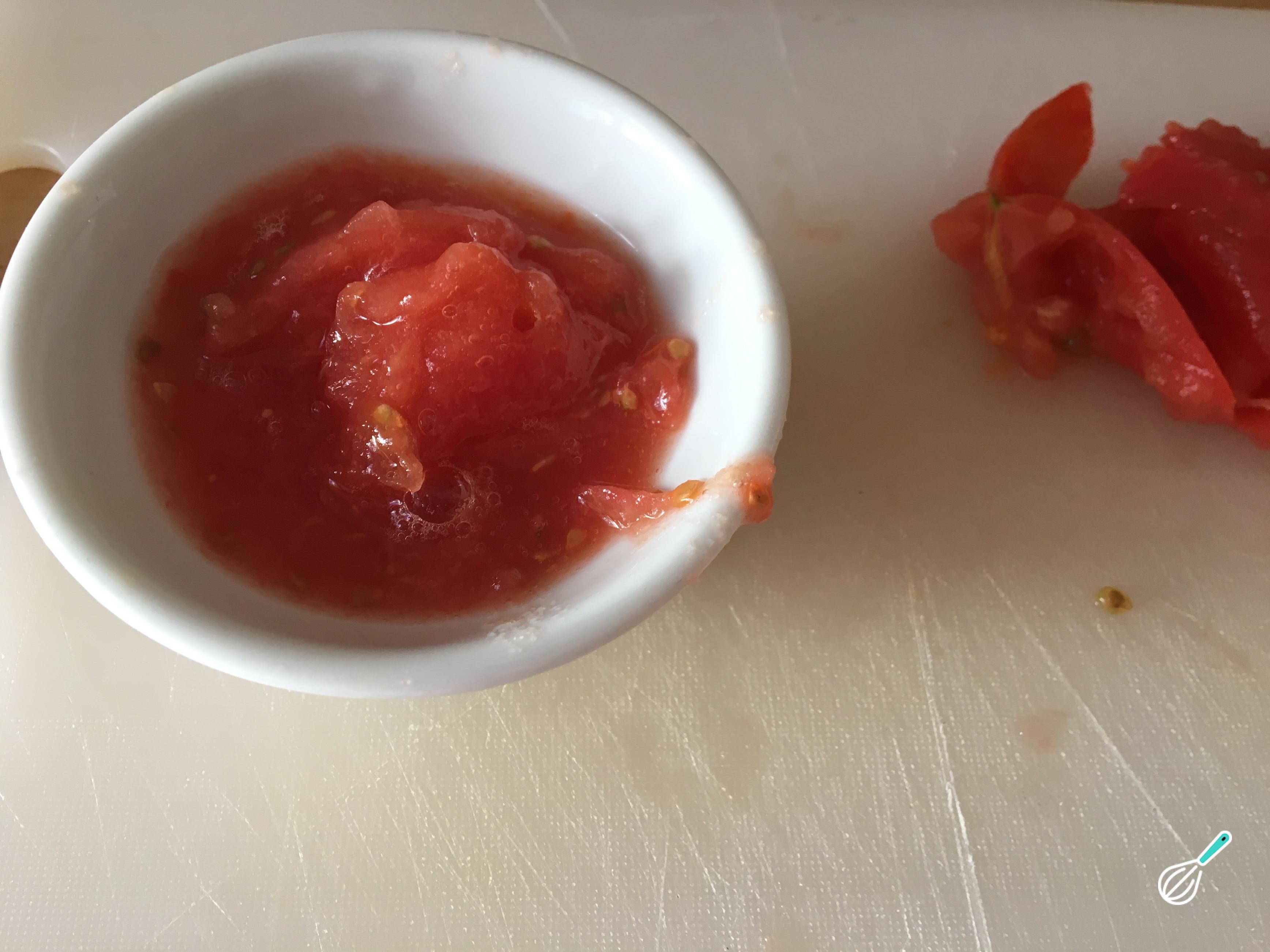 Rale os tomates sem a pele e adicione ao refogado. Deixe cozinhar por mais 2 minutos.