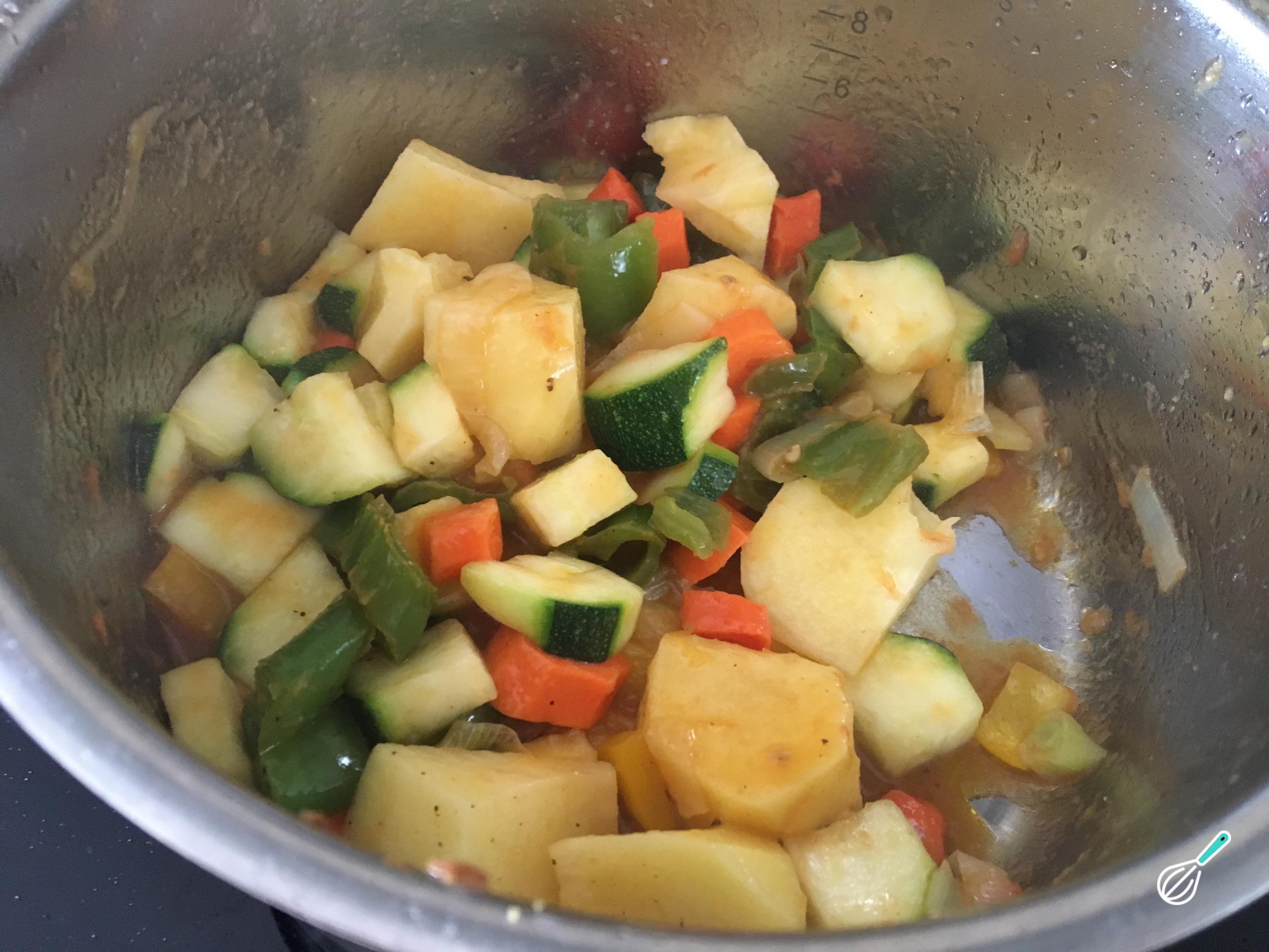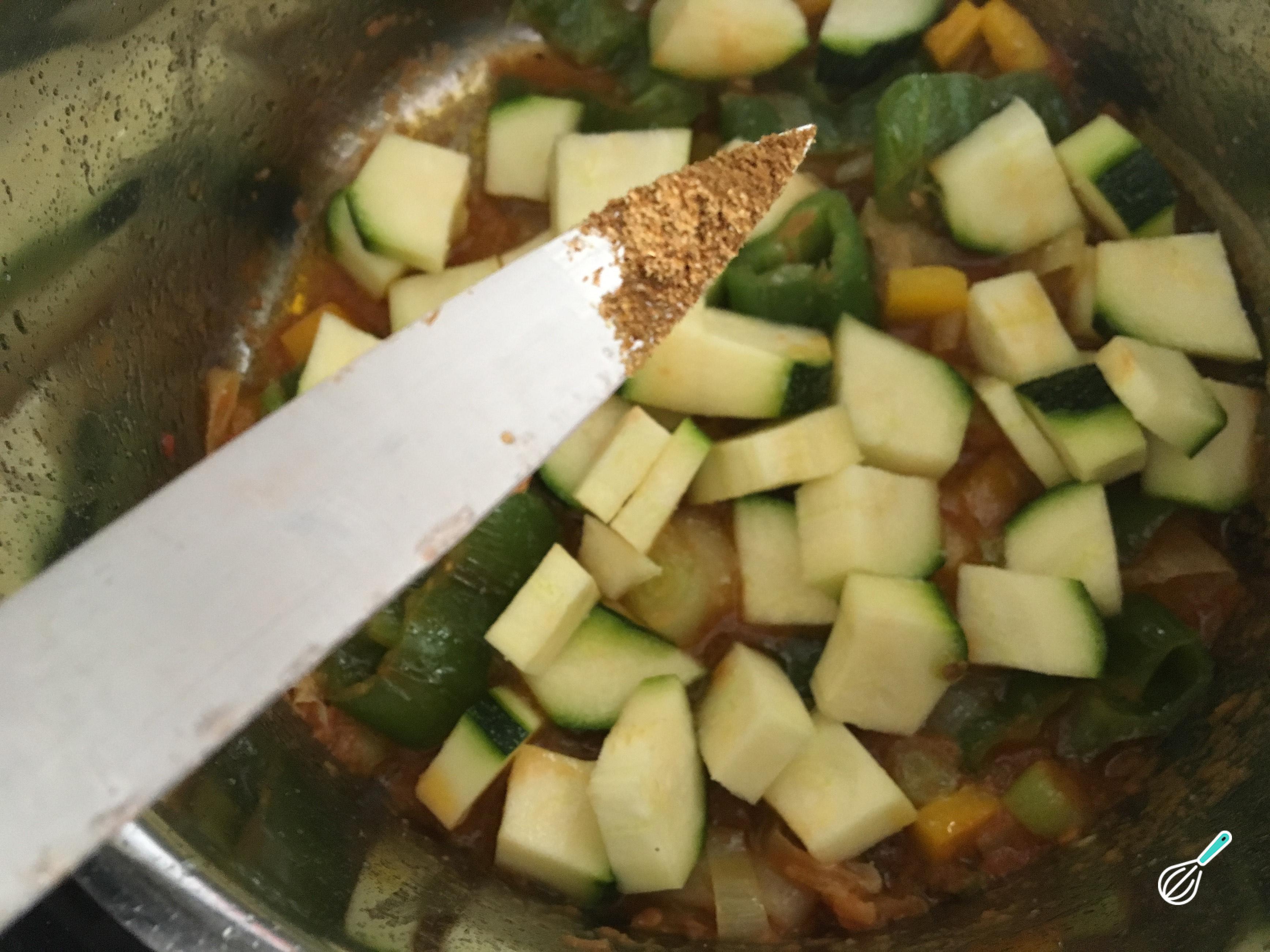 O passo seguinte dessa sopa é juntar a abobrinha descascada e cortada em pedaços e os temperos: os cominhos, sal e pimenta.