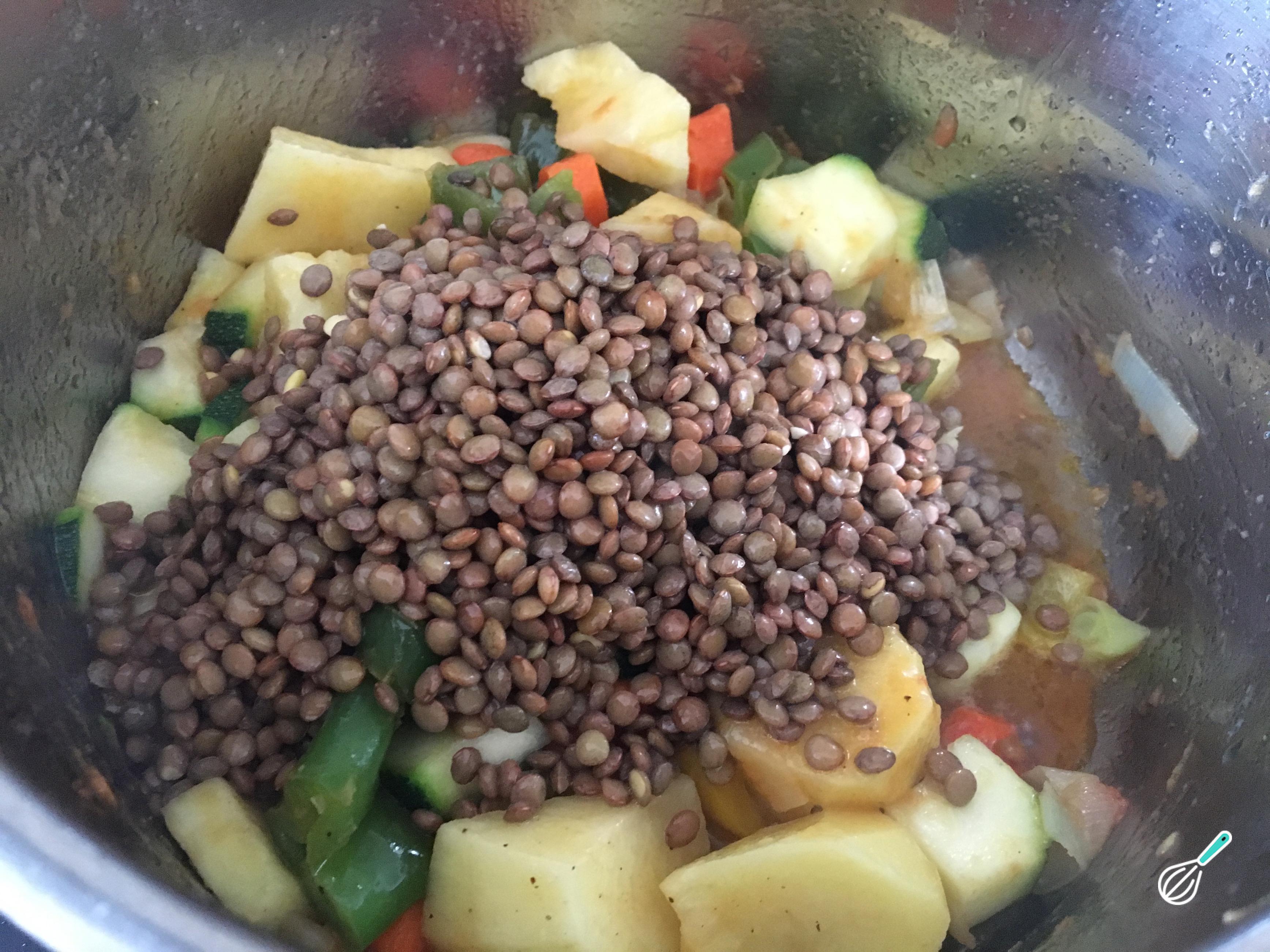 Finalmente acrescente as lentilhas escorridas, cubra os legumes com água e deixe cozer por 20-22 minutos.