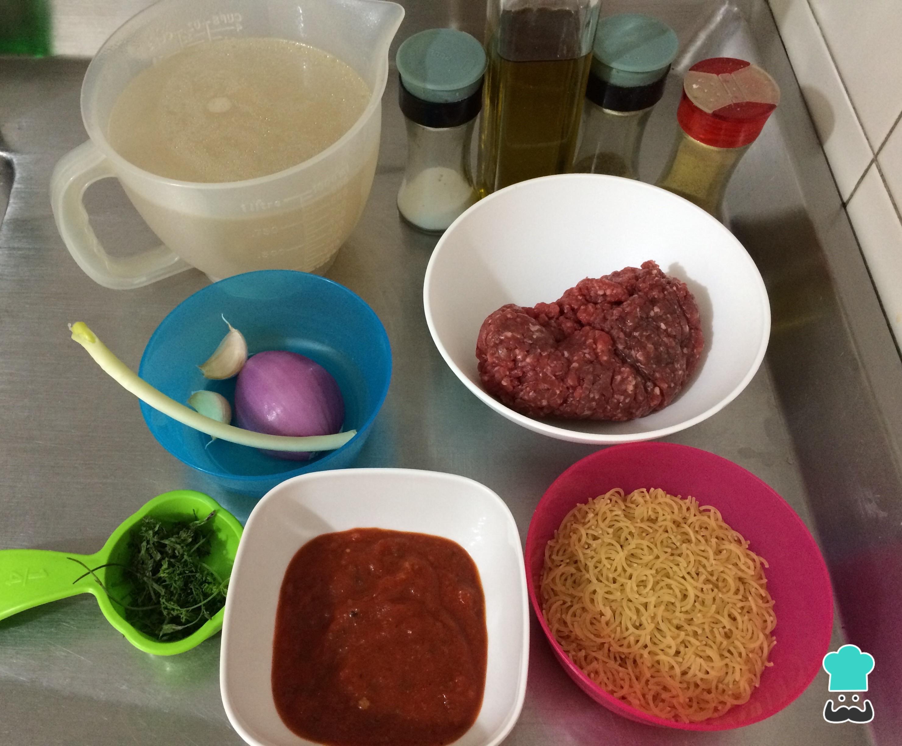 Antes de preparar esta sopa deliciosa de macarrão e carne, o primeiro passo é reunir todos os ingredientes.