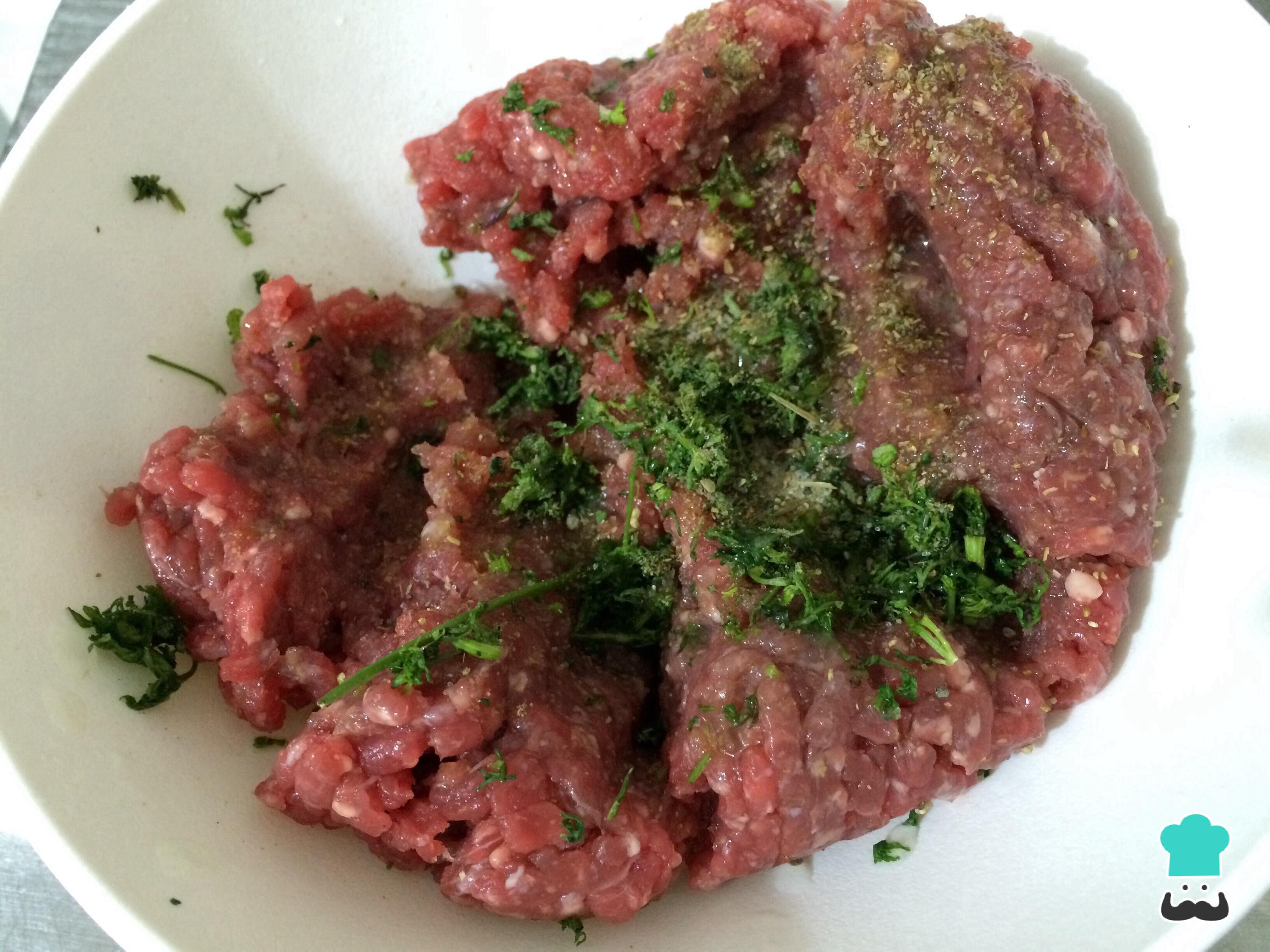 Para fazer as almôndegas caseiras misture a carne moída com metade dos coentros picados, um fio de azeite de oliva, cominhos, sal e pimenta a gosto.