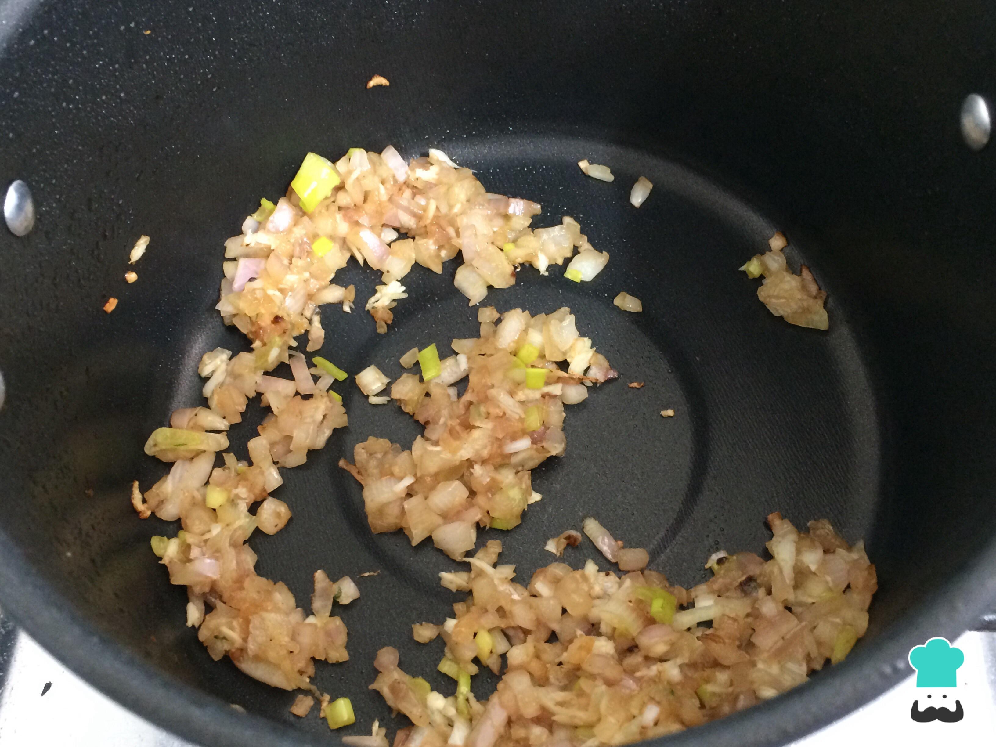 Na mesma panela adicione a cebola e a cebolinha finamente picadas e o alho macerado, refogue em fogo baixo até a cebola ficar transparente.
