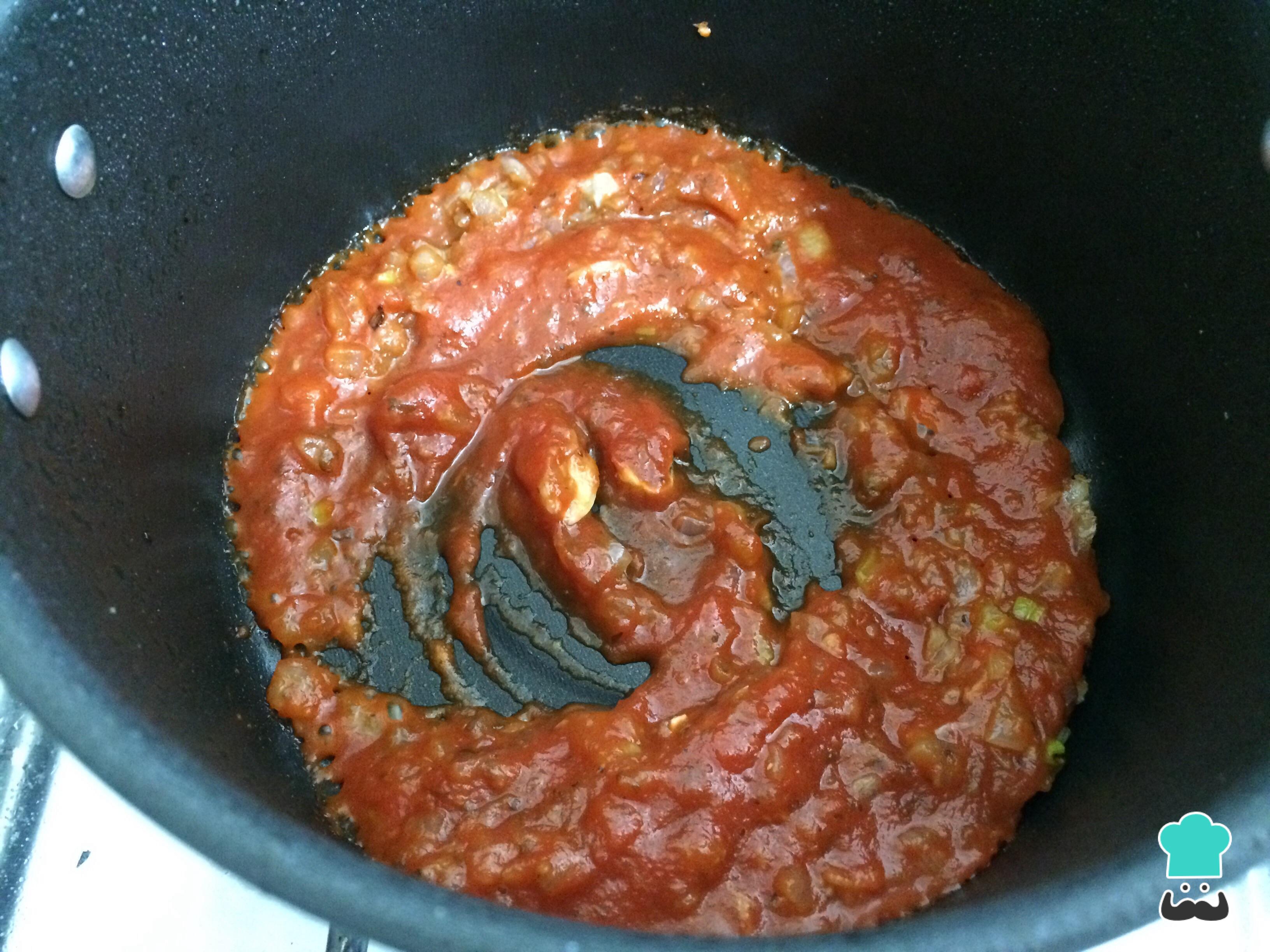 Adicione o molho de tomate e refogue por 1 minuto, mexendo sempre. Para fazer seu próprio molho de tomate, não perca essa receita simples.