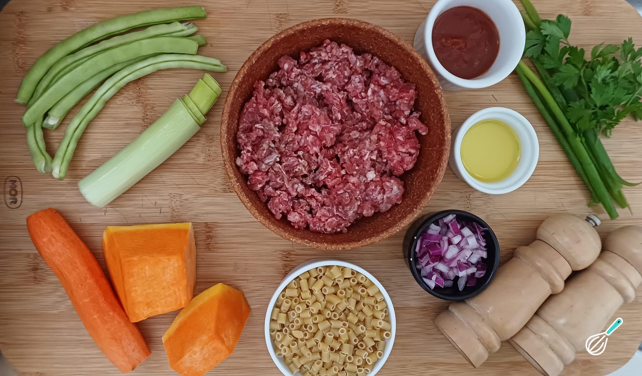 Separe todos os ingredientes para preparar a sua sopa de macarrão com carne moída.