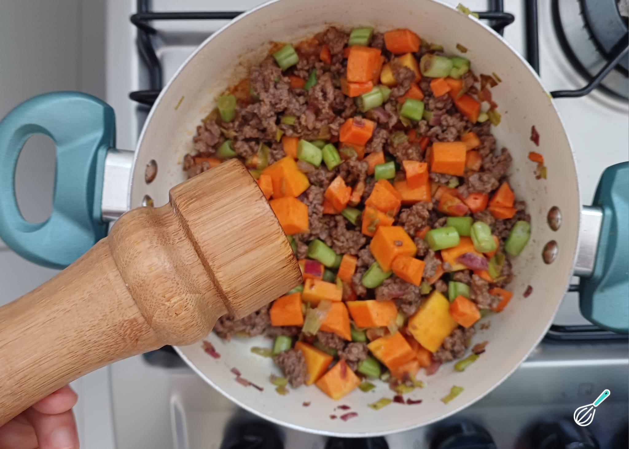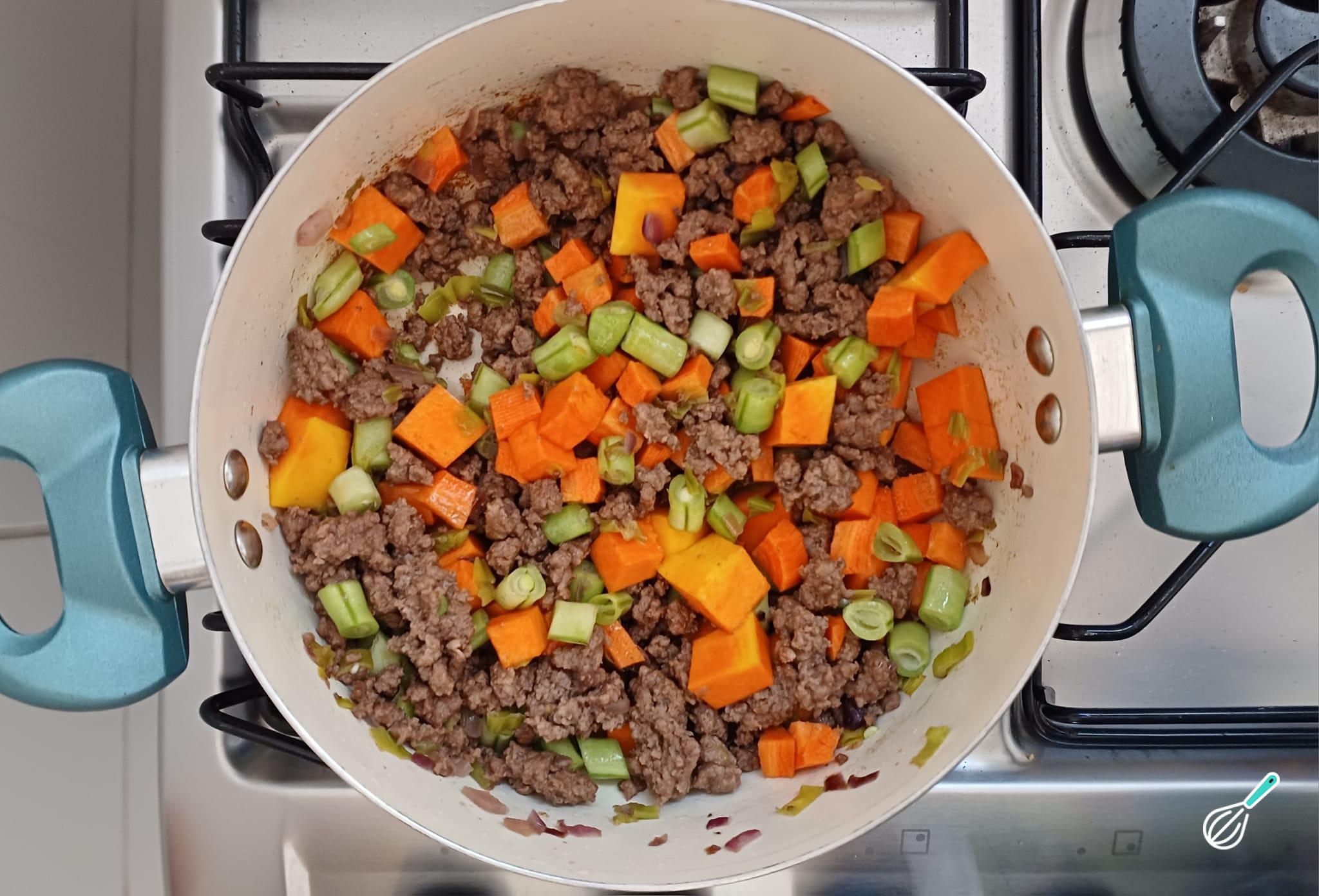 Depois adicione a carne moída e deixe refogando até a carne ficar sequinha, sem caldo.