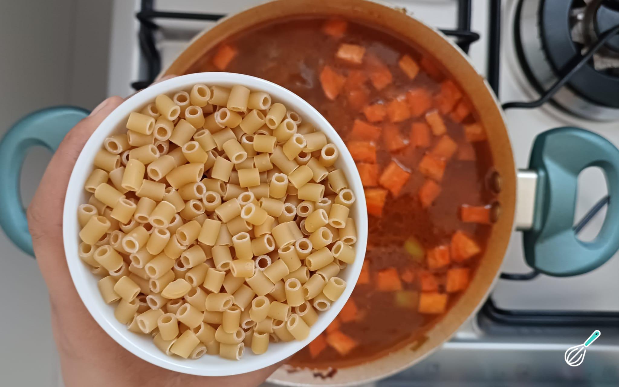 Em seguida, adicione o macarrão de sopa e deixe cozinhar de acordo com o tempo sugerido na embalagem.