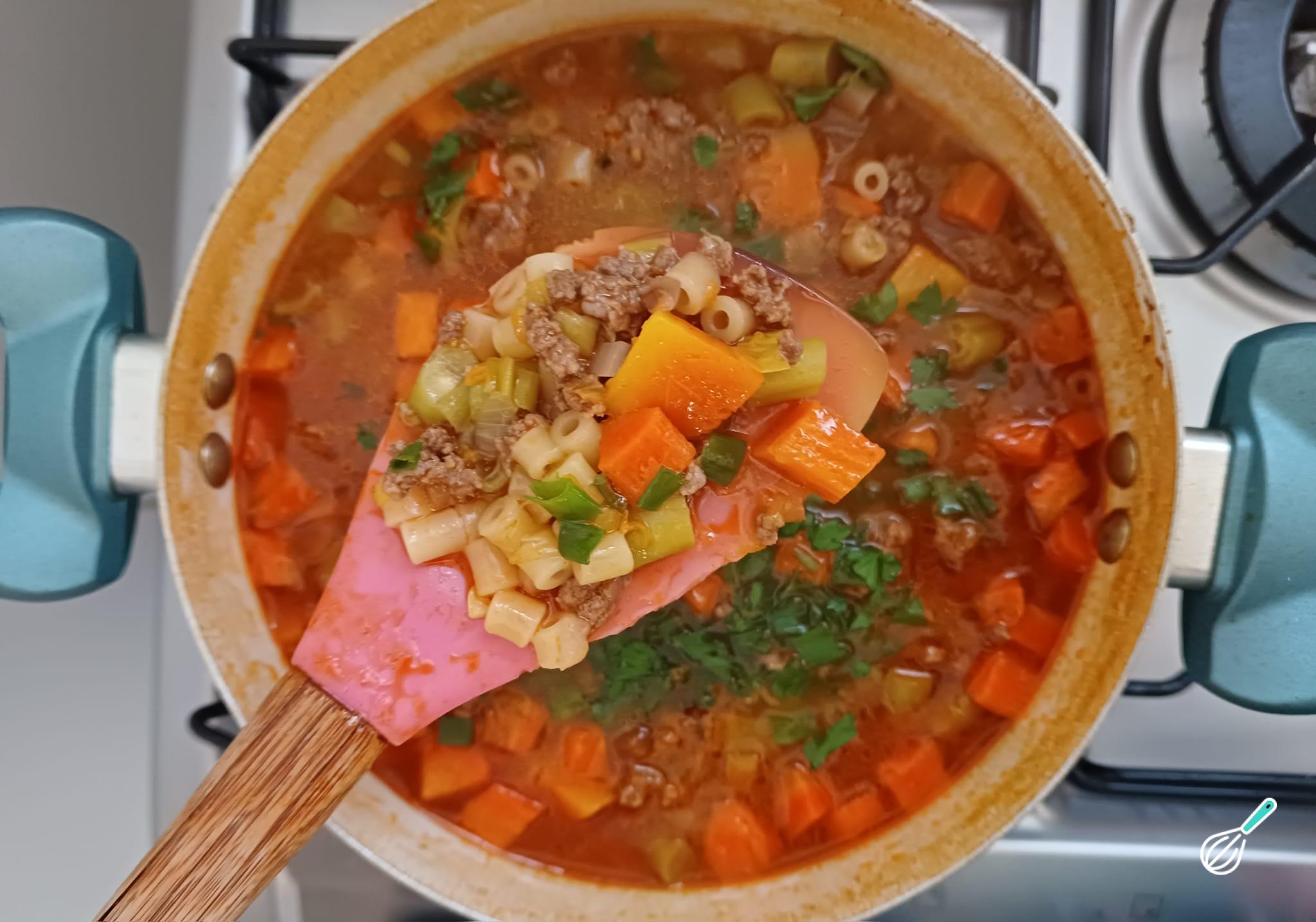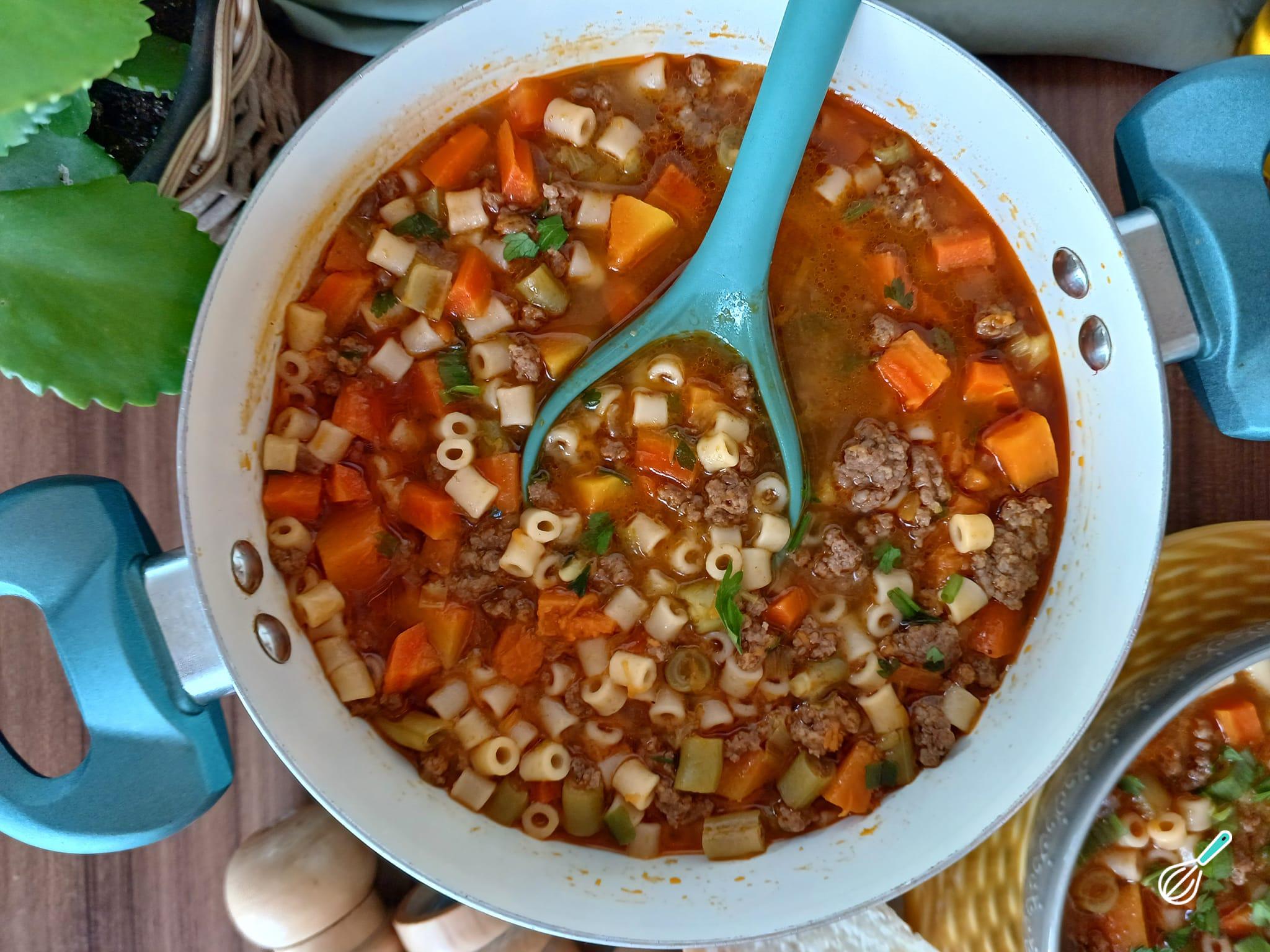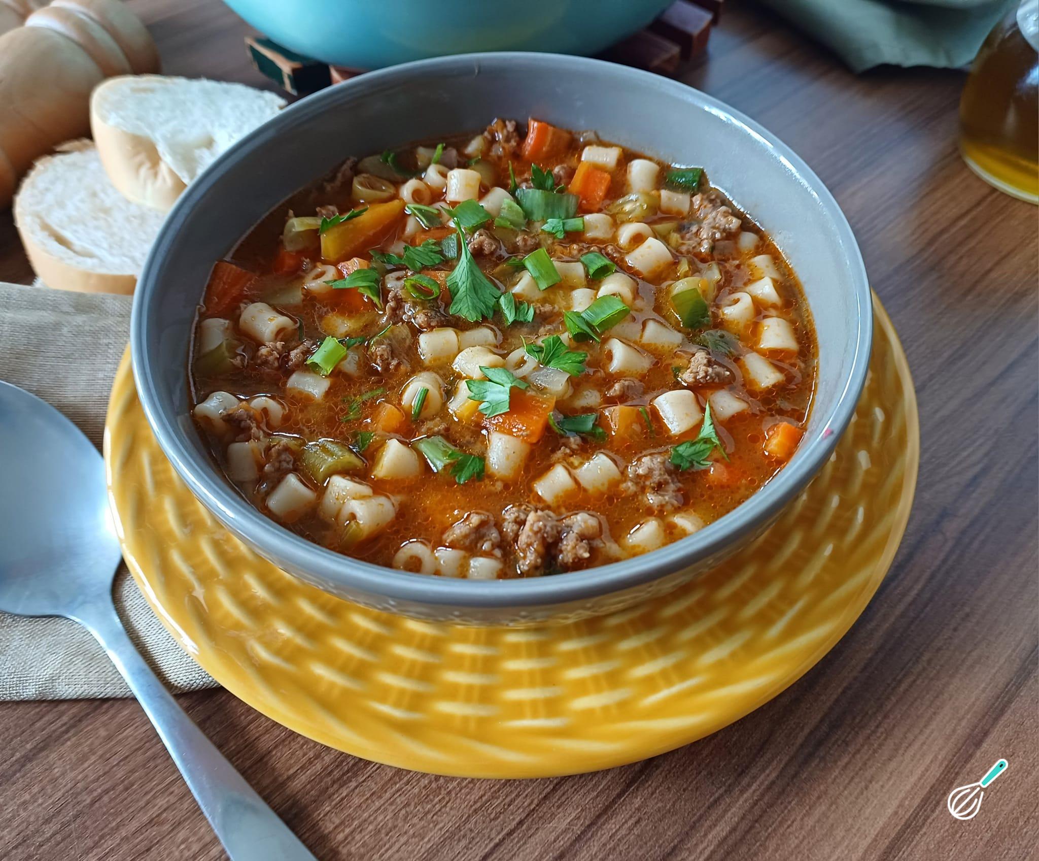 O macarrão adiciona uma textura suave, enquanto a carne moída além de dar sabor, adiciona proteínas para ajudar com a saciedade. Com um caldo aromático e temperos bem equilibrados, esta sopa é perfeta para os dias mais frios.
