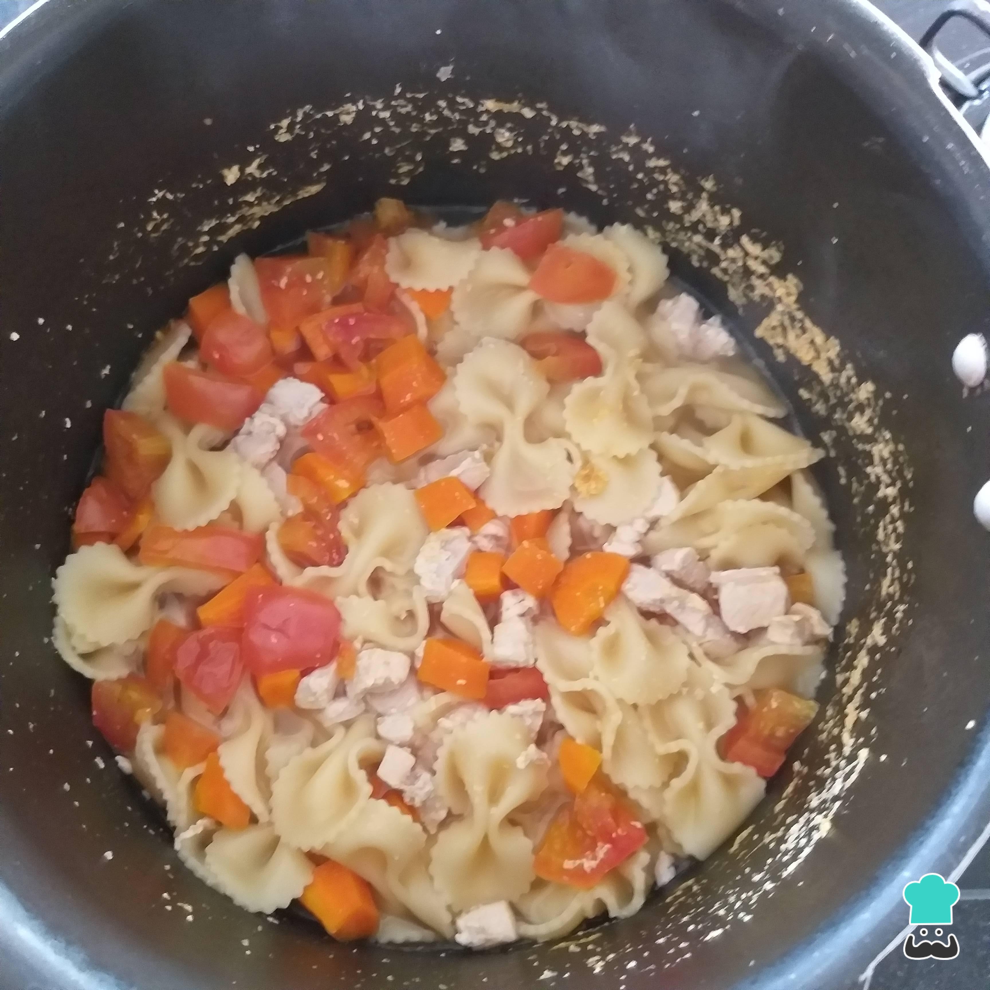 Desligue o fogo, deixe sair a pressão e abra a panela. Verifique o sal e o cozimento do macarrão. Se necessário, coloque mais água e cozinhe por mais alguns minutos na pressão.