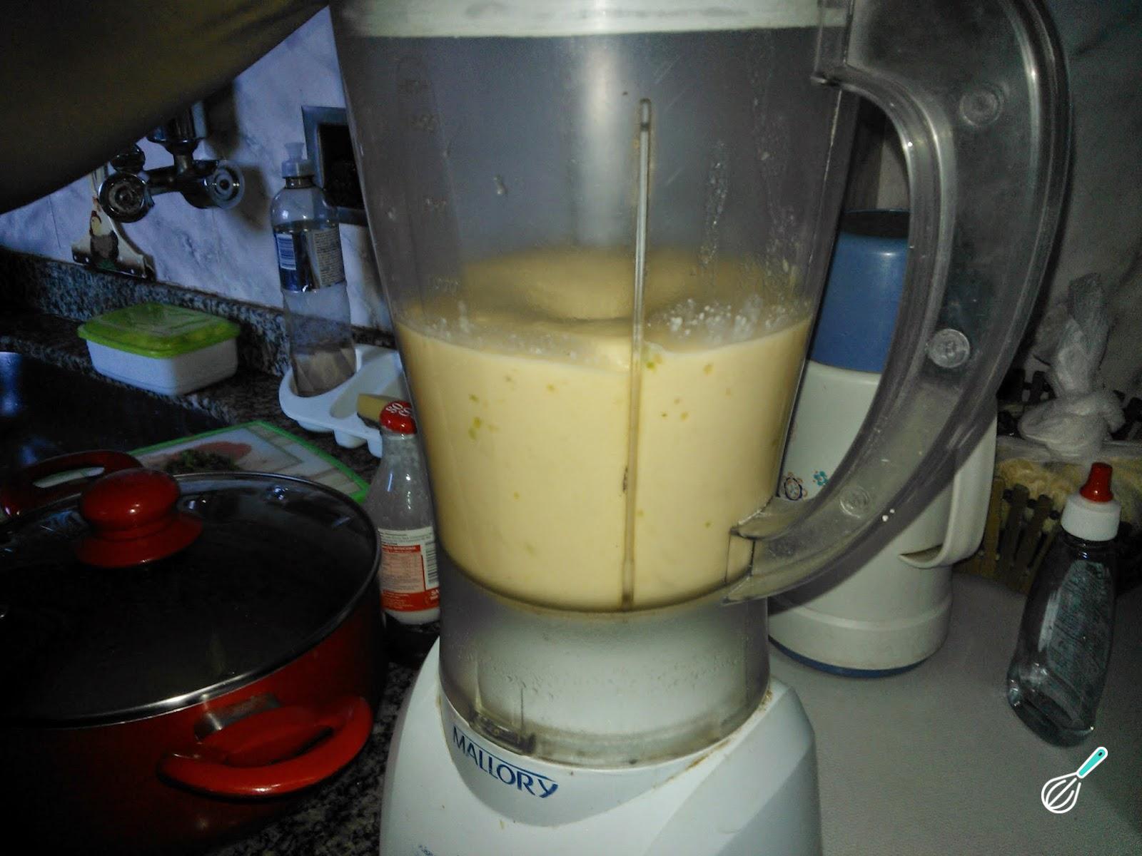 Em seguida, coloque a mandioca previamente cozida no liquidificador. Junte um pouco de água e bata até obter um creme homogêneo.