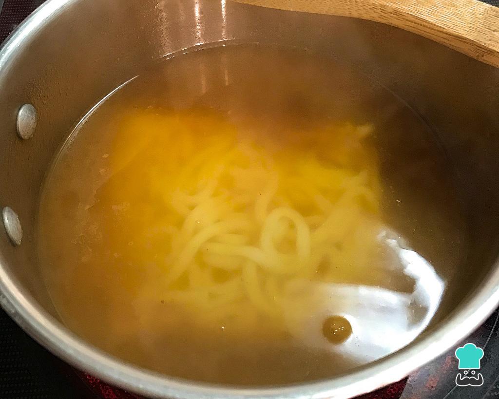 Adicione o macarrão udon e deixe ferver por mais 3 minutos.