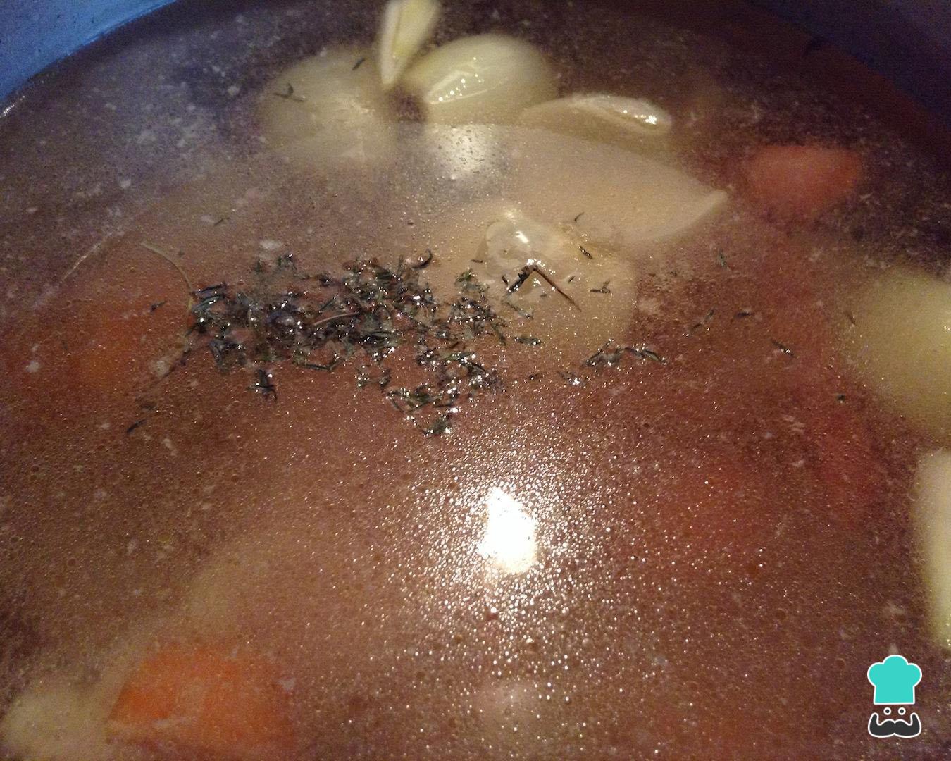 Prepare os legumes: descasque e pique as cenouras, as batatas e a cebola. Coloque na panela de pressão junto com o alho descascado, cubra com o caldo de galinha e adicione ervas a gosto - eu usei um mix de ervas finas.