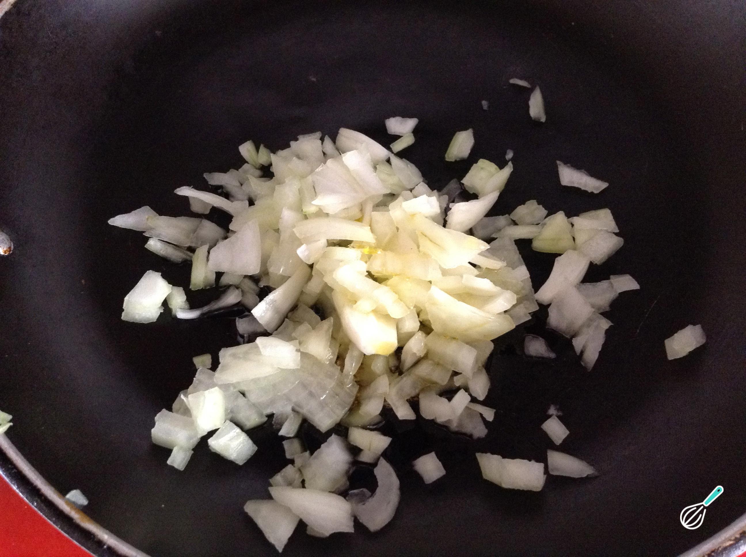 Lave a cebola e corte em cubos mais pequenos possível. Leve ao fogo fogo uma frigideira com um pouco de óleo e refogue nela a cebola, sem deixar dourar.
