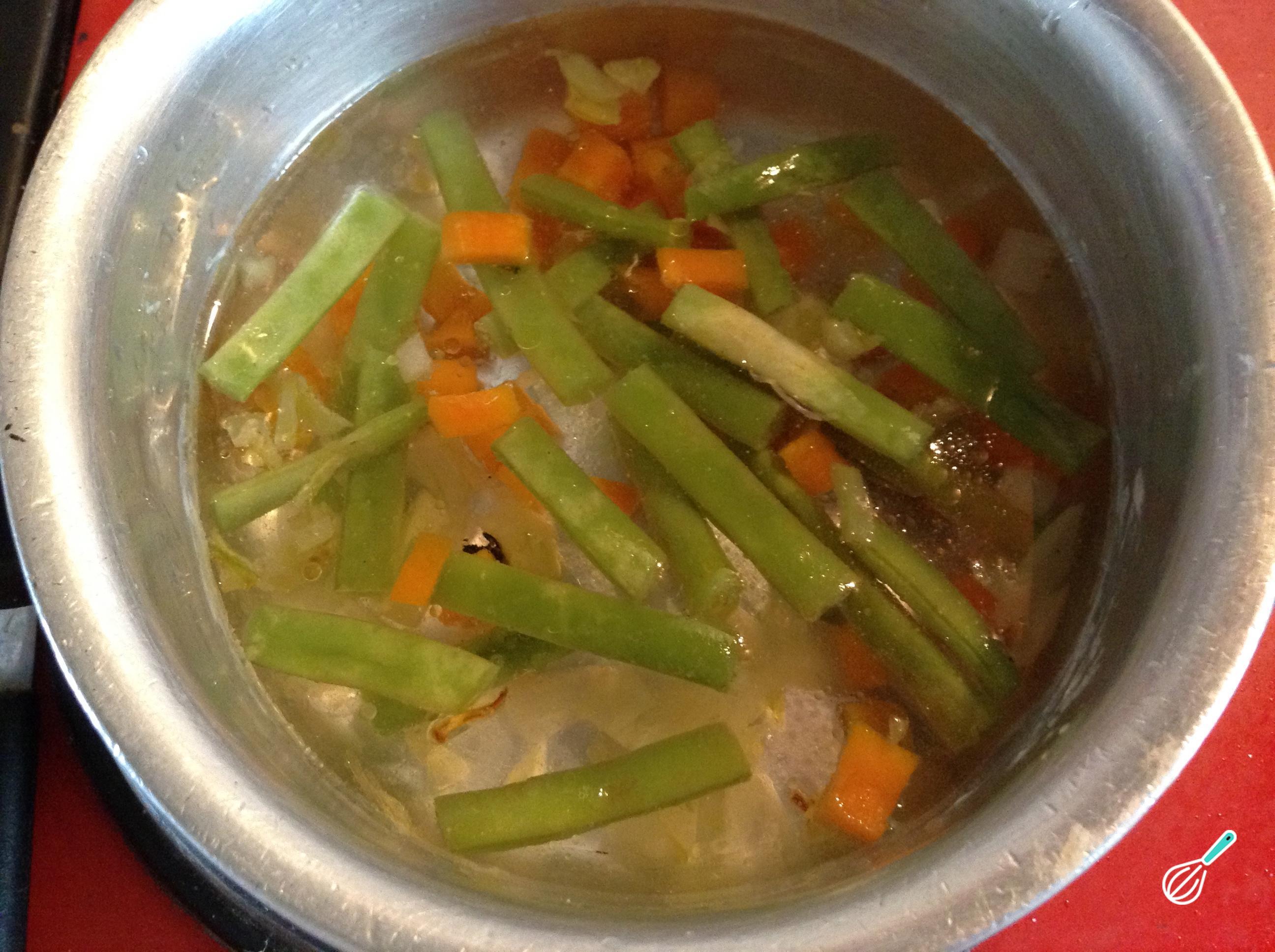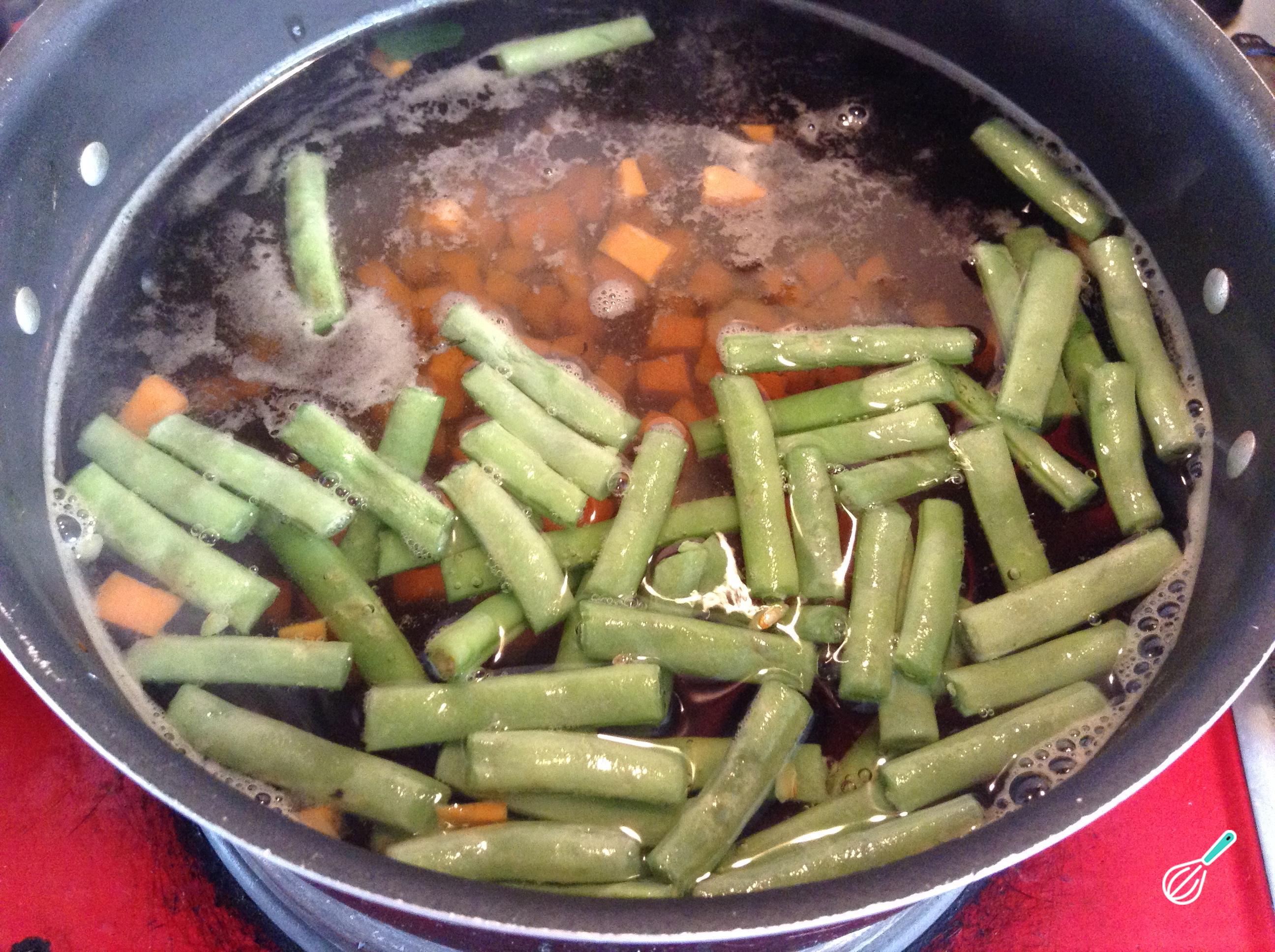 Enquanto refoga a cebola, continue preparando a sopa de quinoa: leve uma panela com água ao fogo alto e, quando ferver, adicione a vagem e a cenoura. Tempere com um pouco de sal e cozinhe até que estejam macias ou al dente, o que demorará cerca de 15 minutos.