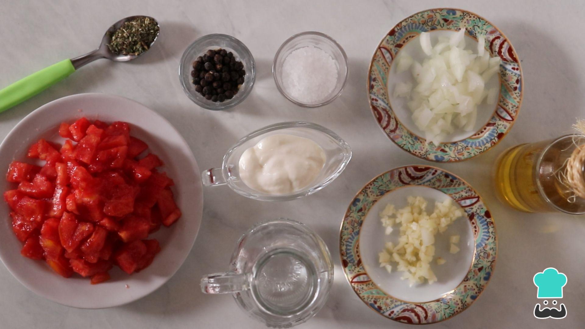 Comece separando os ingredientes. O tomate deve estar sem pele, sem sementes e cortado em cubinhos.