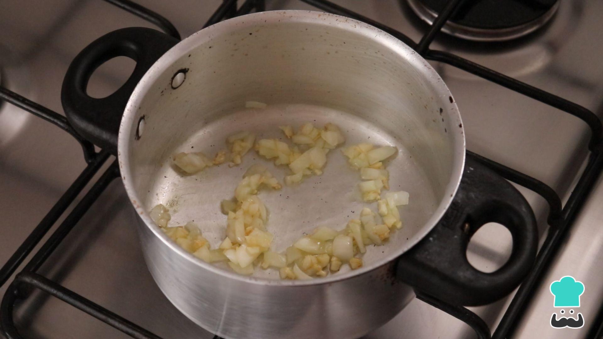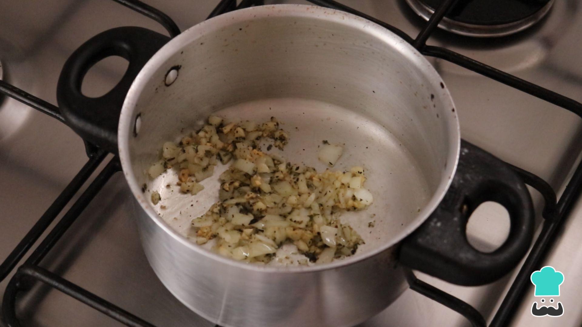 Leve uma panela ao fogo médio, despeje o azeite e refogue o alho e a cebola.