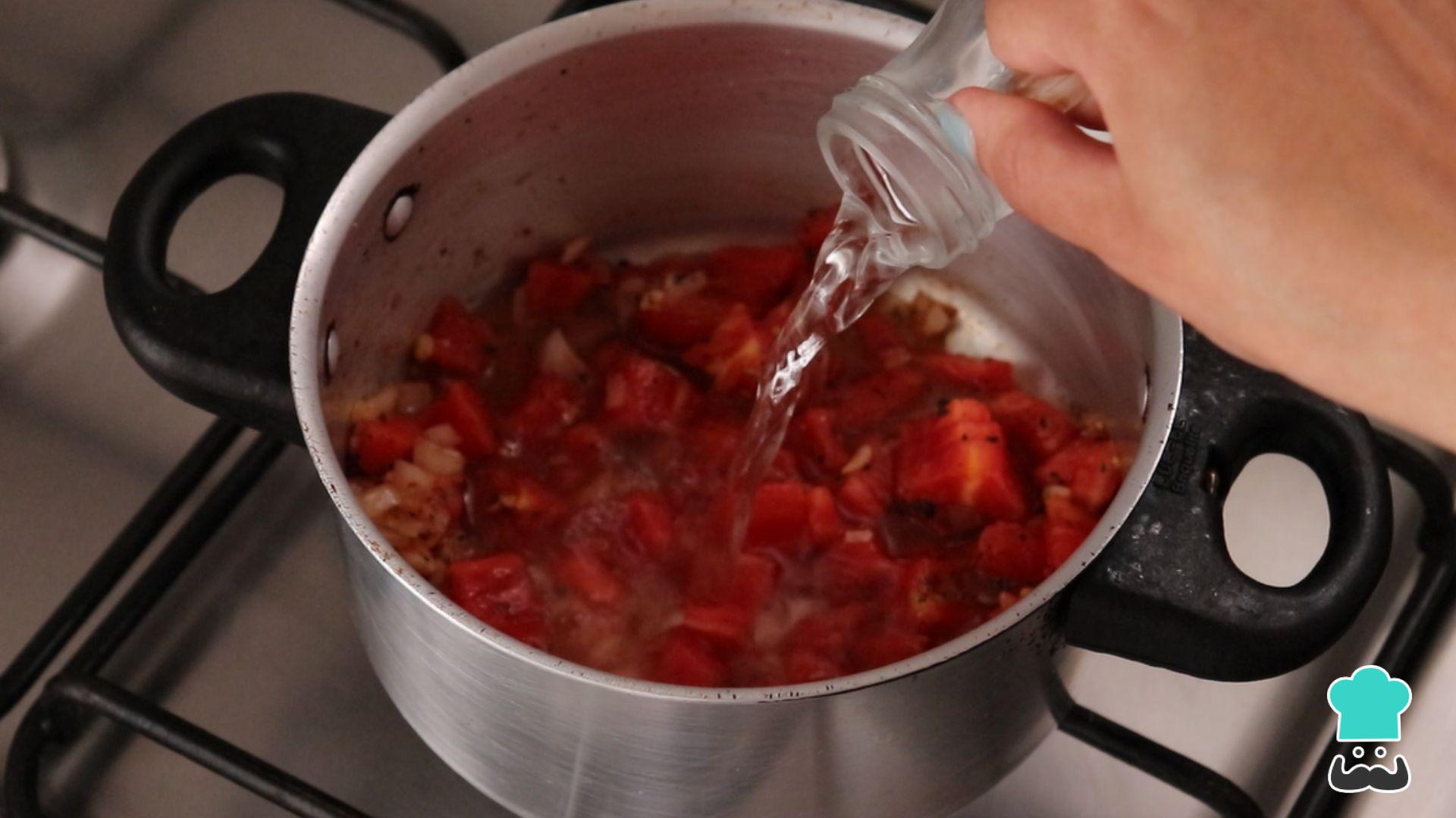 Coloque o tomate picado e mexa bem para pegar o sabor do refogado. Despeje a água e cozinhe por mais ou menos 10 minutos, até o tomate ficar bem macio.