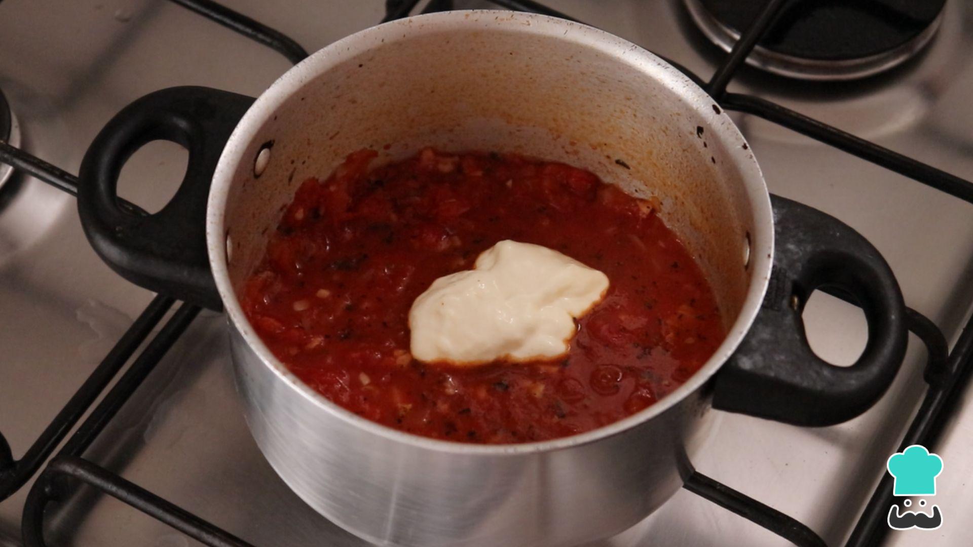 Com um mixer ou um amassador de batatas amasse os tomates até ficar na textura que você deseja: mais liso ou mais rústico (você também pode bater no liquidificador se quiser). Desligue o fogo e finalize com o creme de leite.