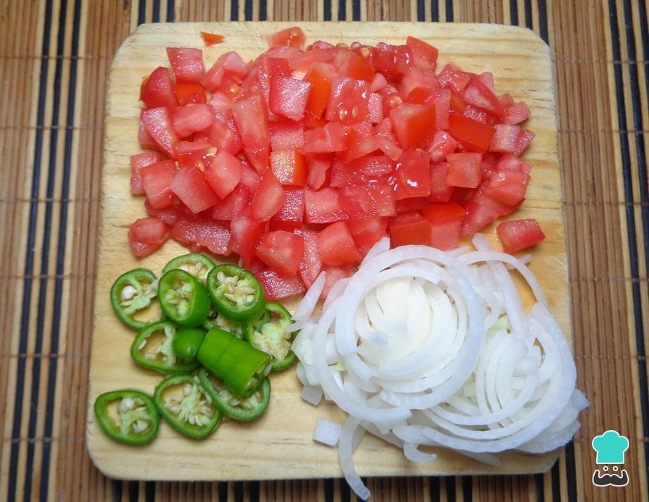 Em seguida pique o tomate sem as sementes, corte em meias-luas a cebola e a pimenta em rodelas.