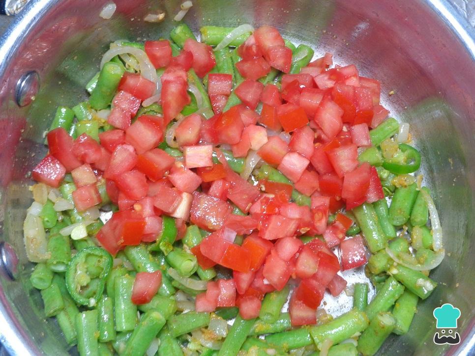 Por ultimo adicione o tomate e um pouco de água. Tempere a gosto com sal e pimenta e deixe cozinhar por 7 minutos, ou até a vagem estar macia.