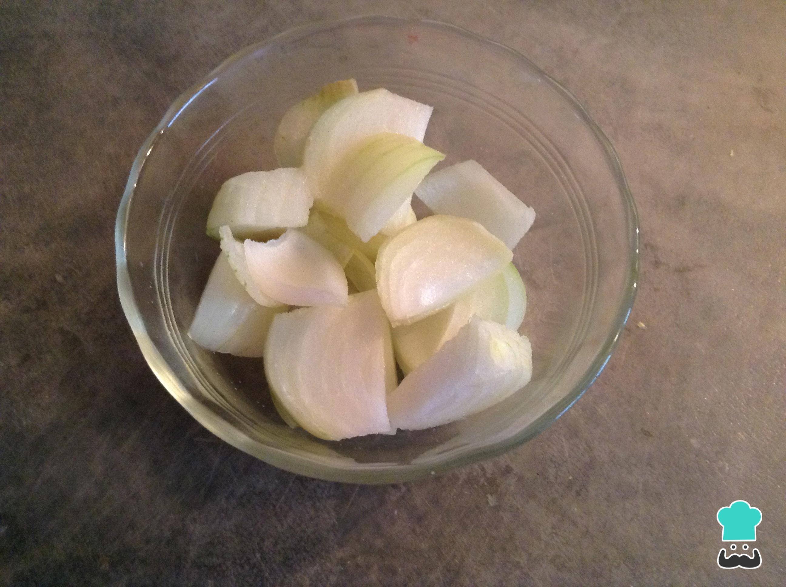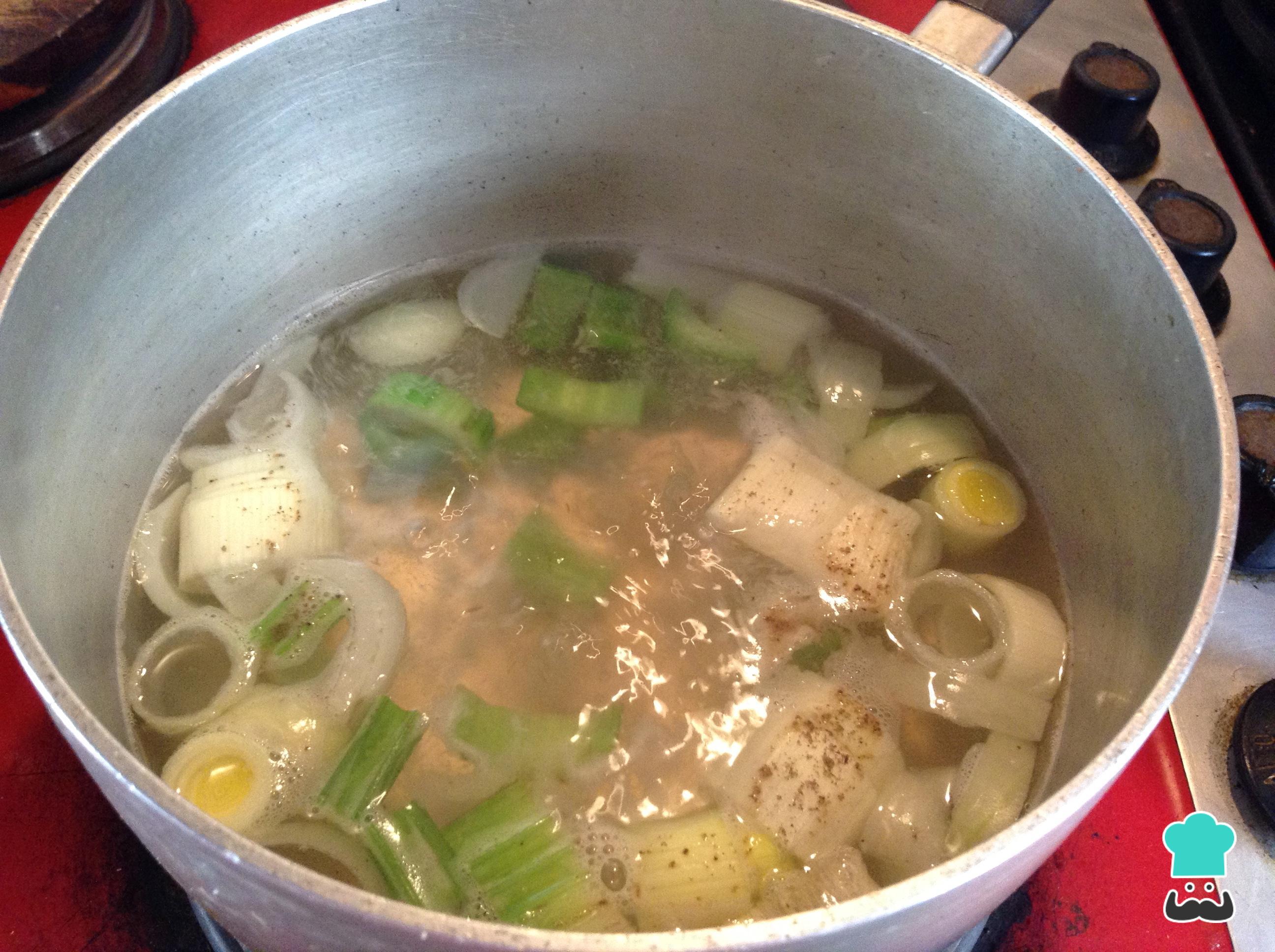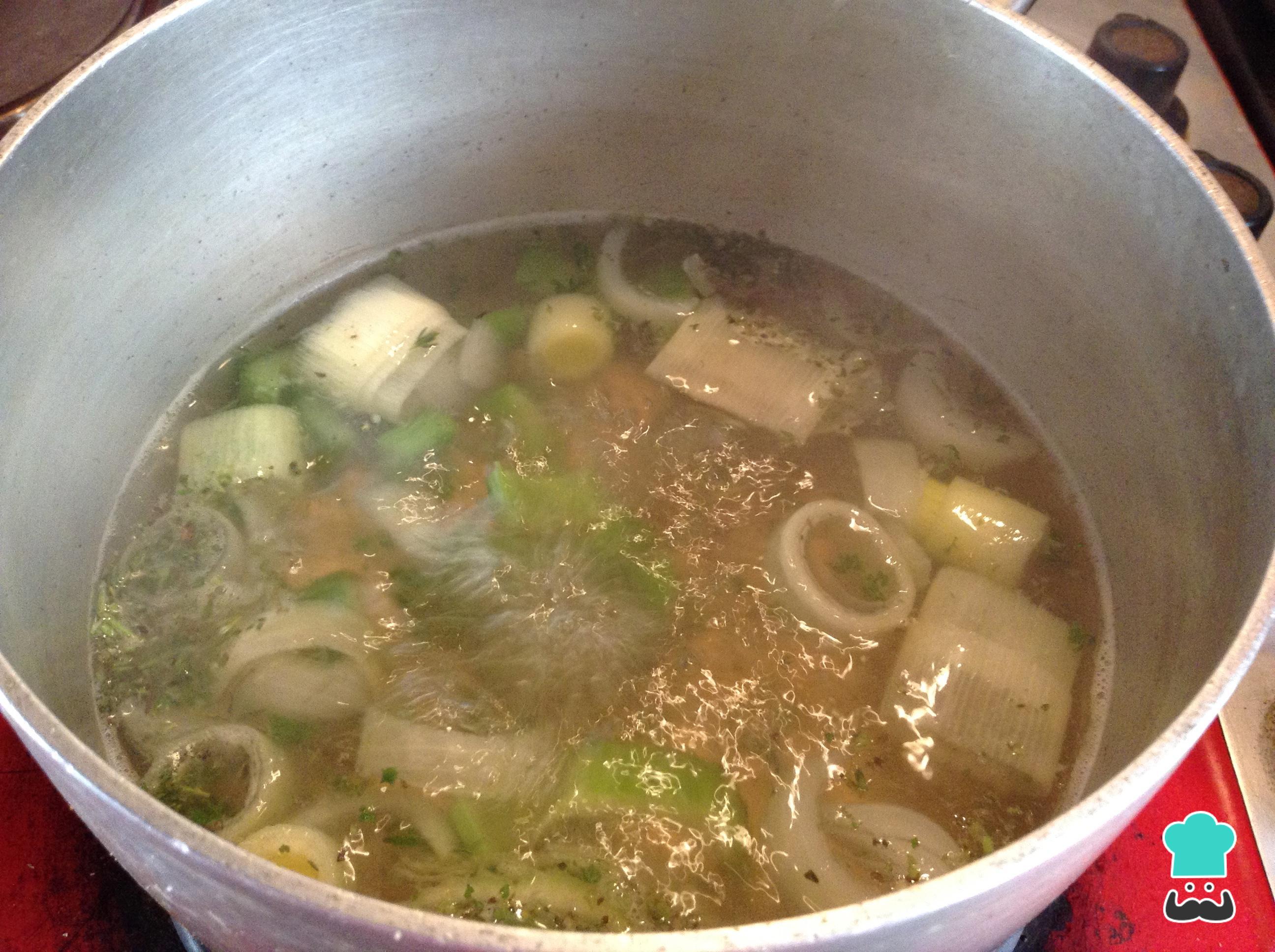 Lave a cebola em pedaços grandes. Faça o mesmo com o alho porro e o aipo.