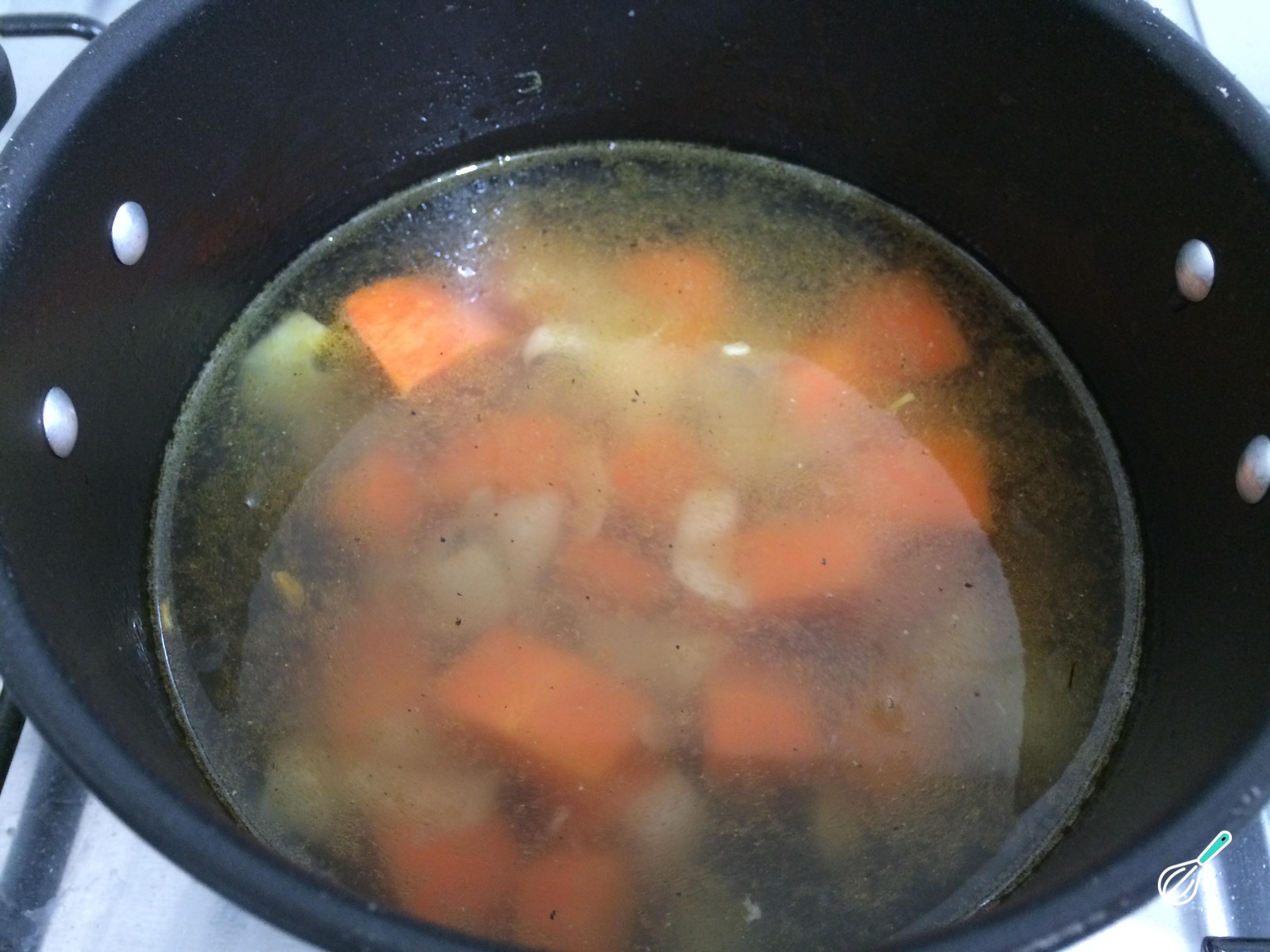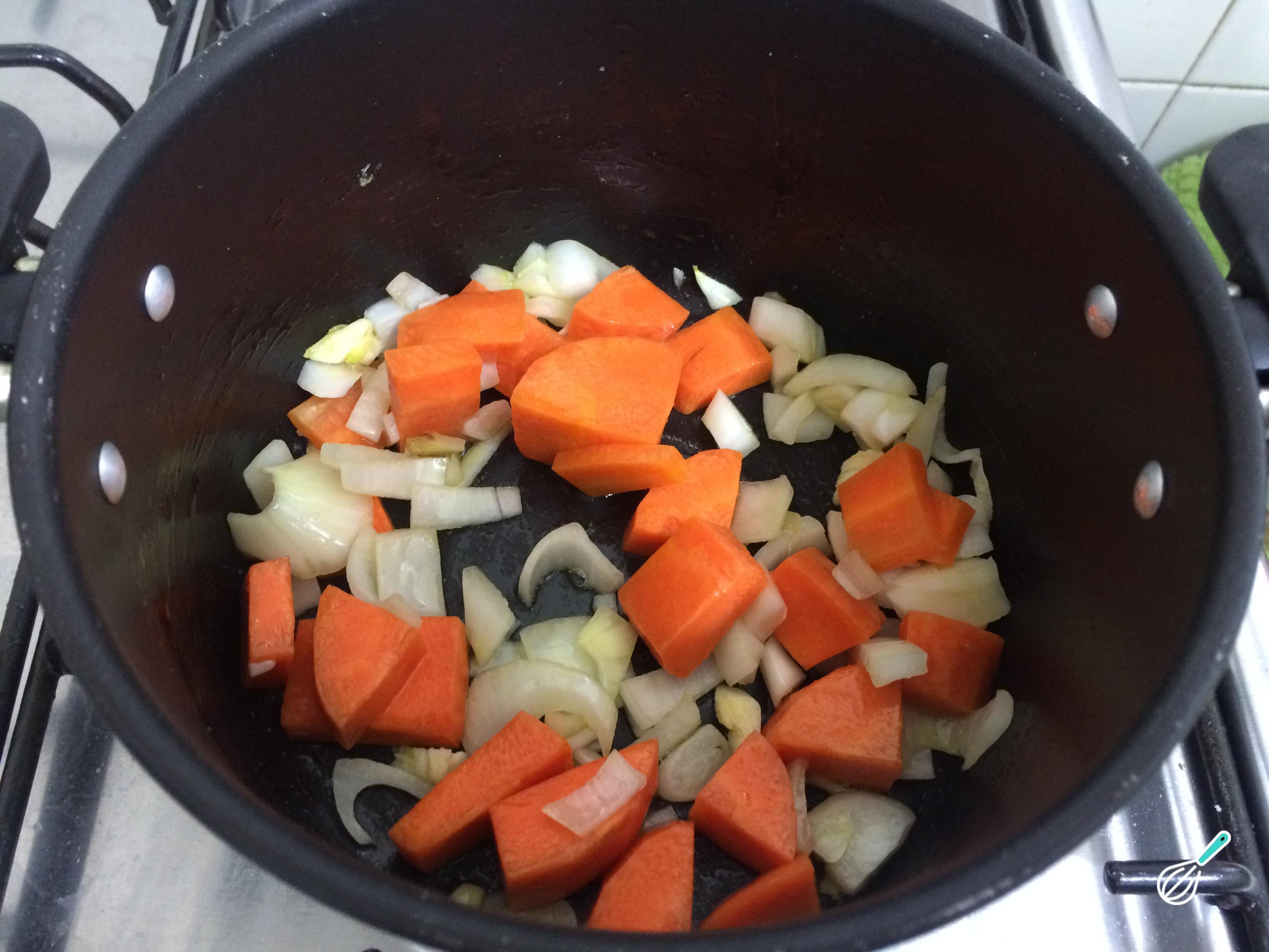 Em uma panela com um pouco de azeite, refogue por alguns minutos a cenoura, alho e cebola, tudo cortado em pequenos pedaços.