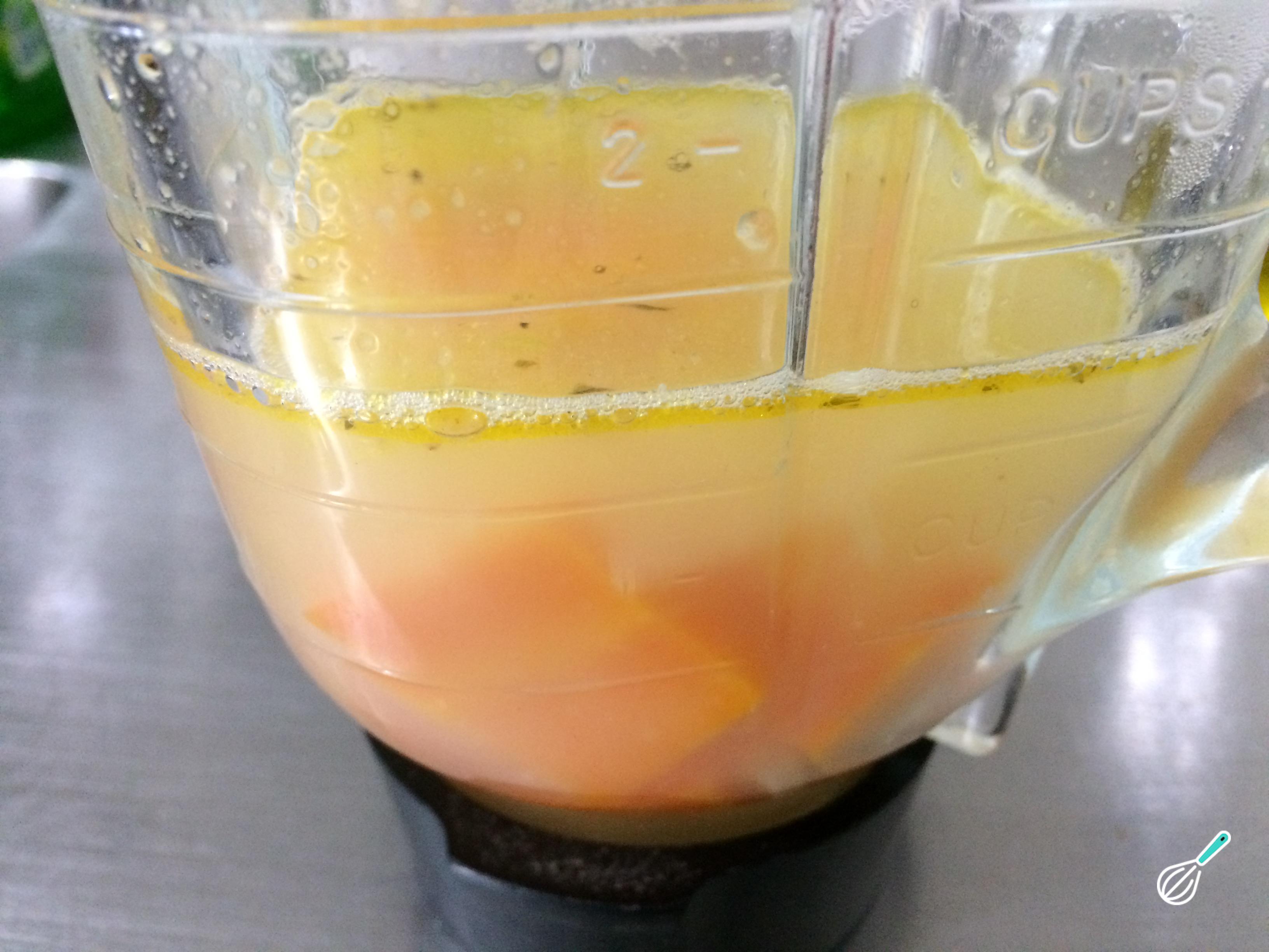 Depois do tempo indicado, bata os ingredientes no liquidificador ou com um mixer, até obter um creme homogêneo. Se necessário, coe a sopa e, por fim, reserve na geladeira por 30 minutos.