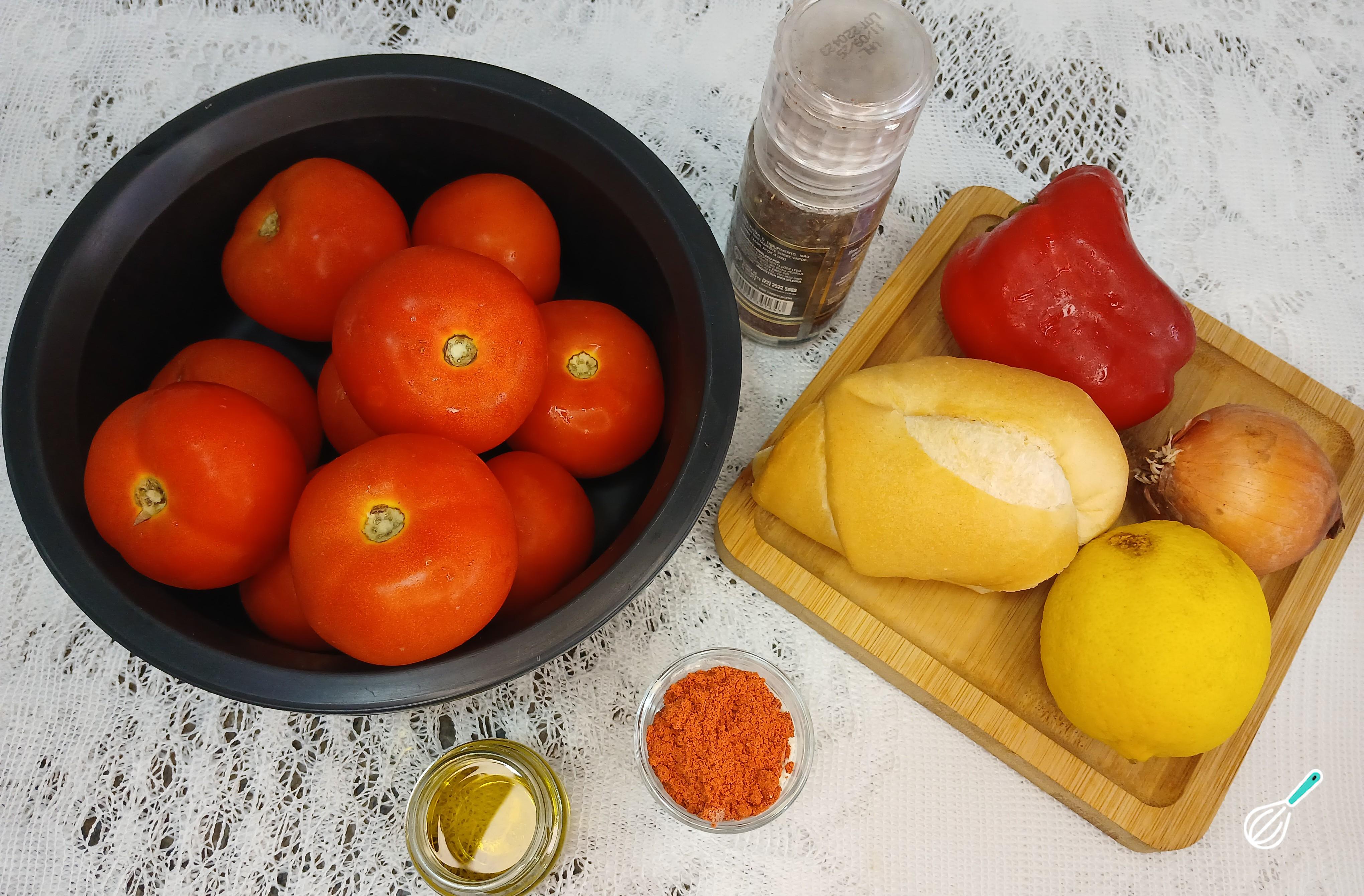 Comece separando os ingredientes para o preparo da sopa fria de origem espanhola. Separe os tomates, o pimentão vermelho, o azeite, o pão, a cebola, o limão, sal e pimenta a gosto. Separe também os temperos.