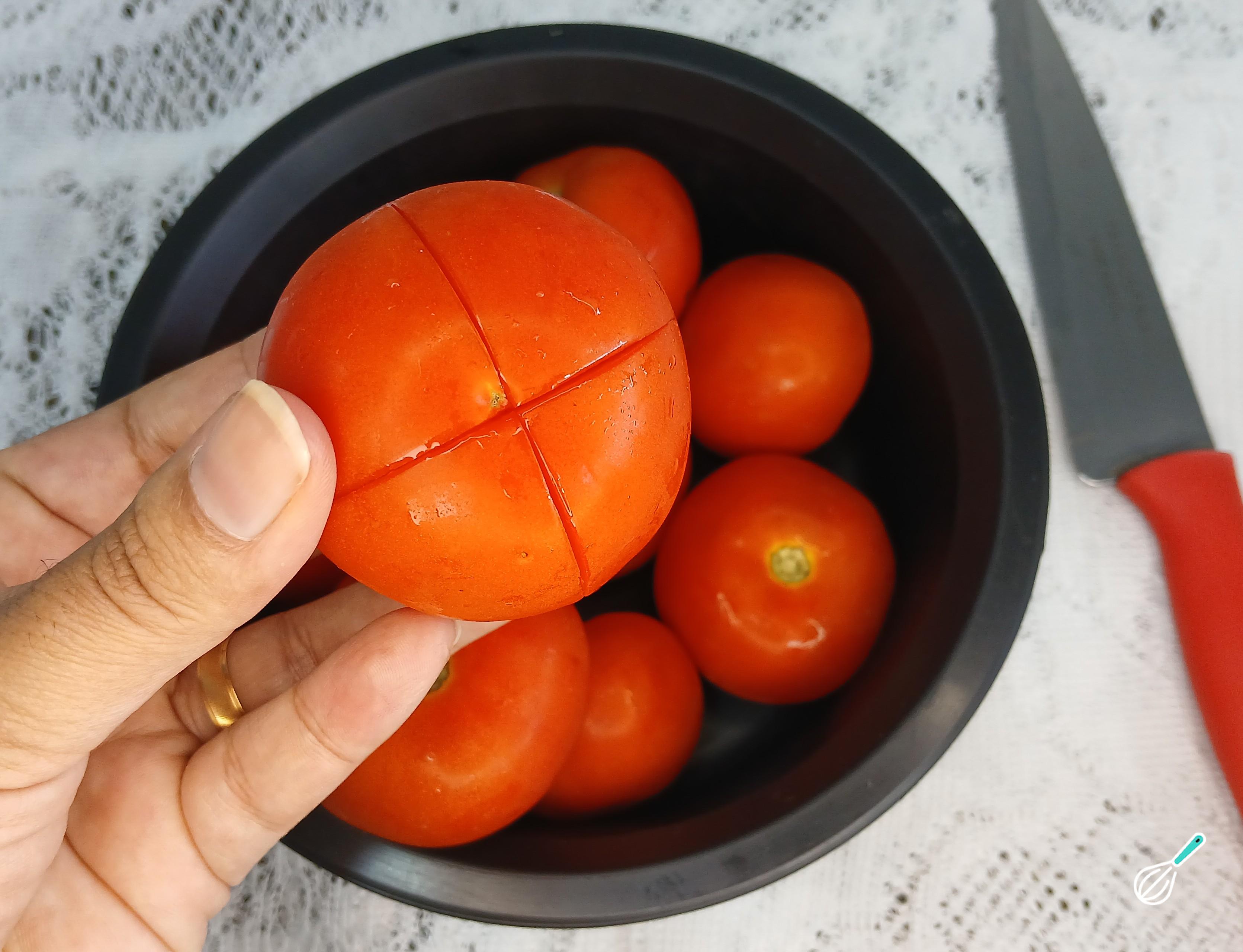 Feito isso, lave os tomates e faça um corte em cruz em cada um deles. O corte não precisa se fundo, isto é feito somente para facilitar a retirada da pele dos tomates.
