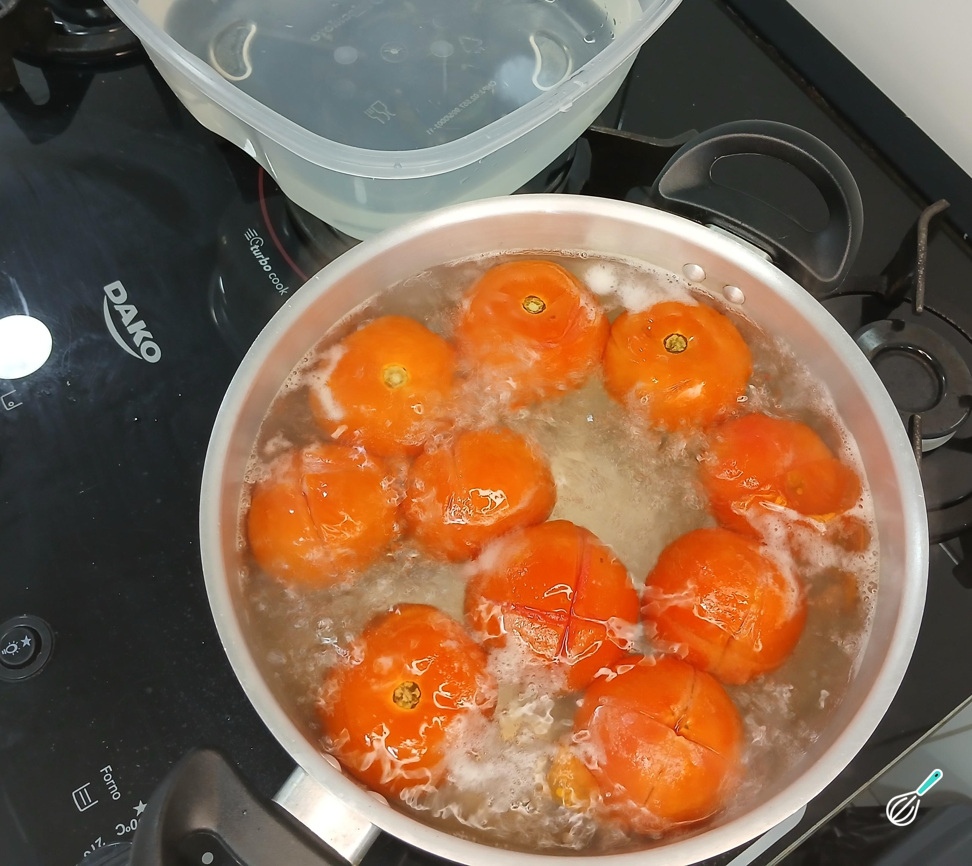 Dica: Esta etapa é importante para que a retirada das peles do tomate seja efetiva e não machuque os tomates ou os danifique.