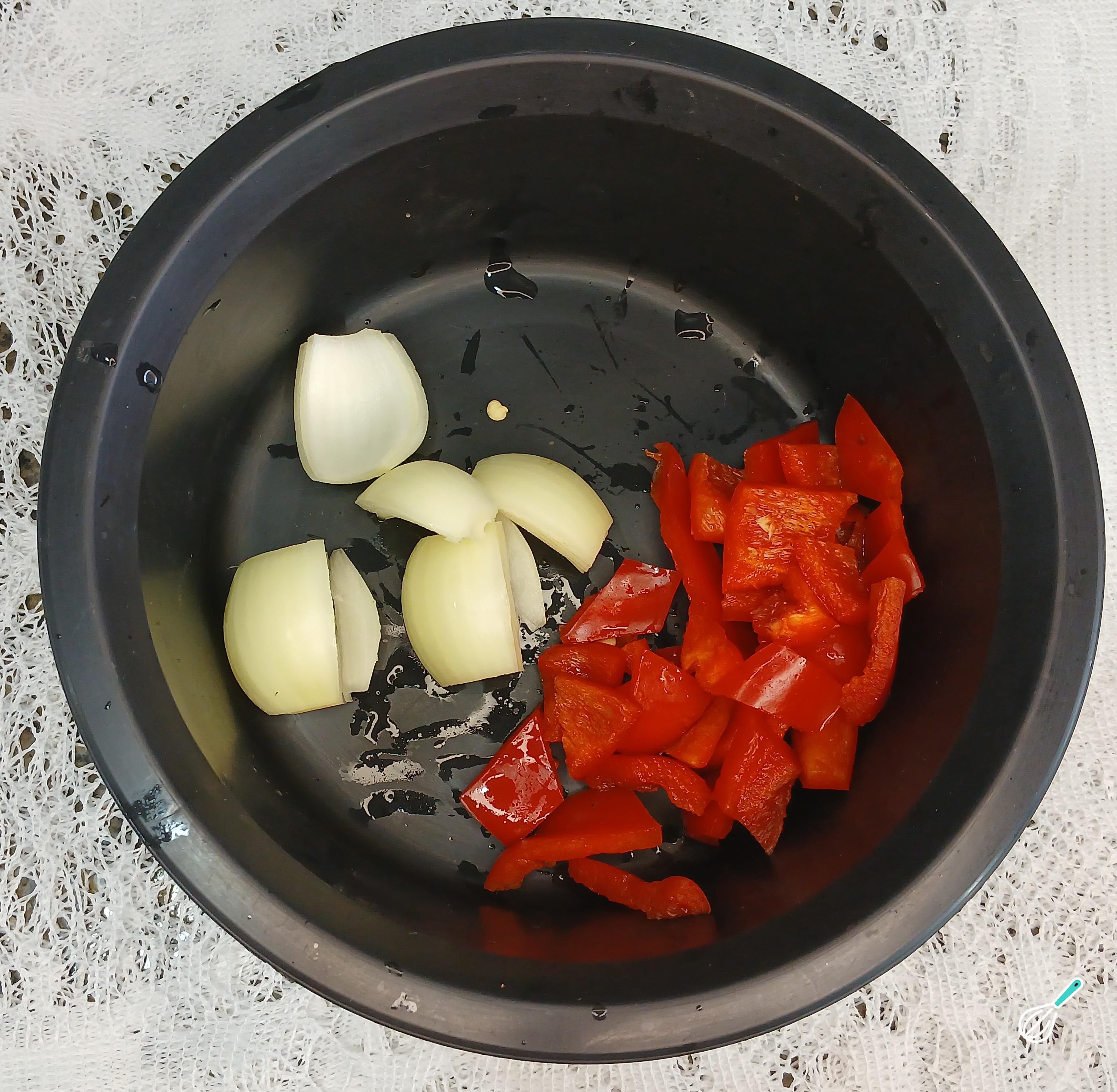 Enquanto os tomates fervem, corte a cebola em meia lua e o pimentão em pedaços quadrados e pequenos, limpe bem o pimentão por dentro. Reserve.
