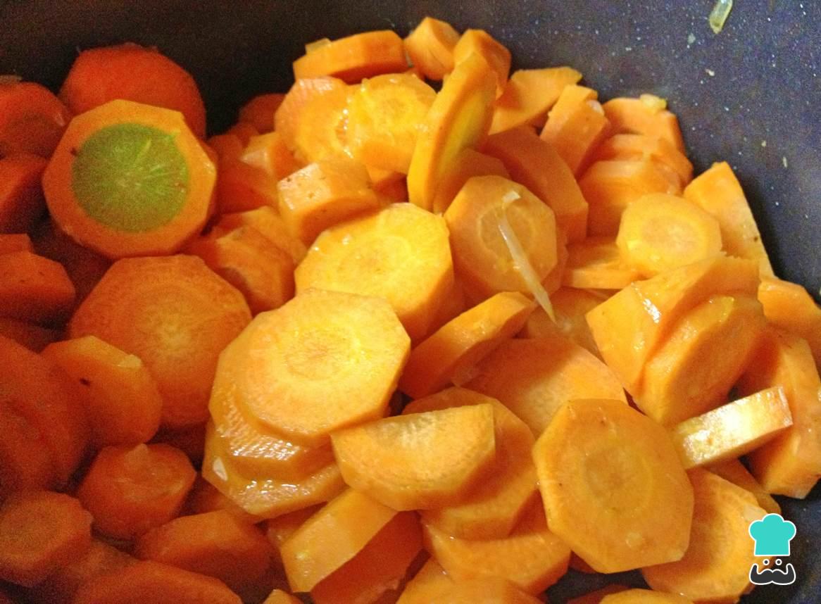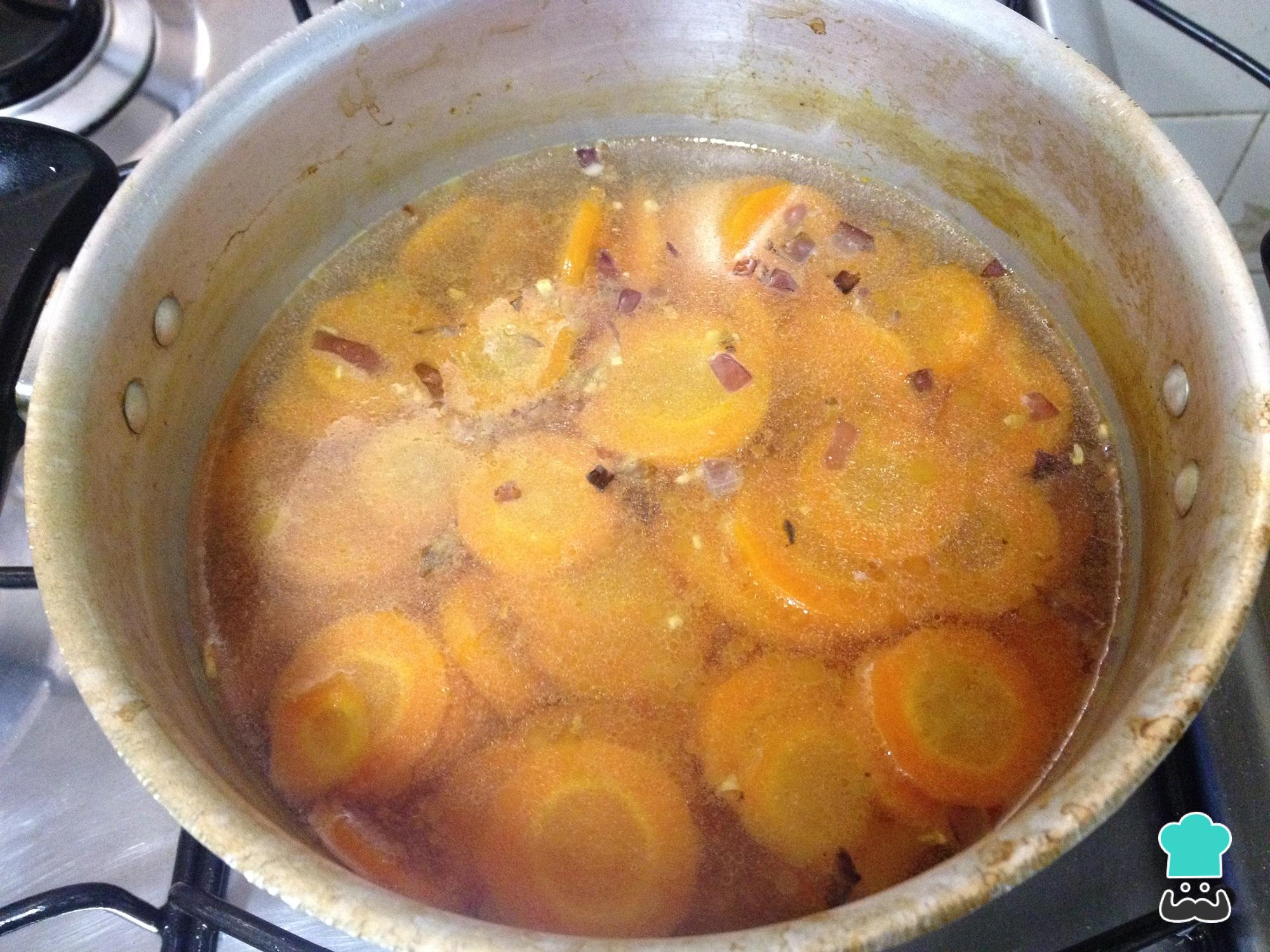 Descasque e corte as cenouras em rodelas e acrescente ao refogado, junto com o gengibre descascado e ralado. Deixe cozinhar, mexendo por 10 minutos.