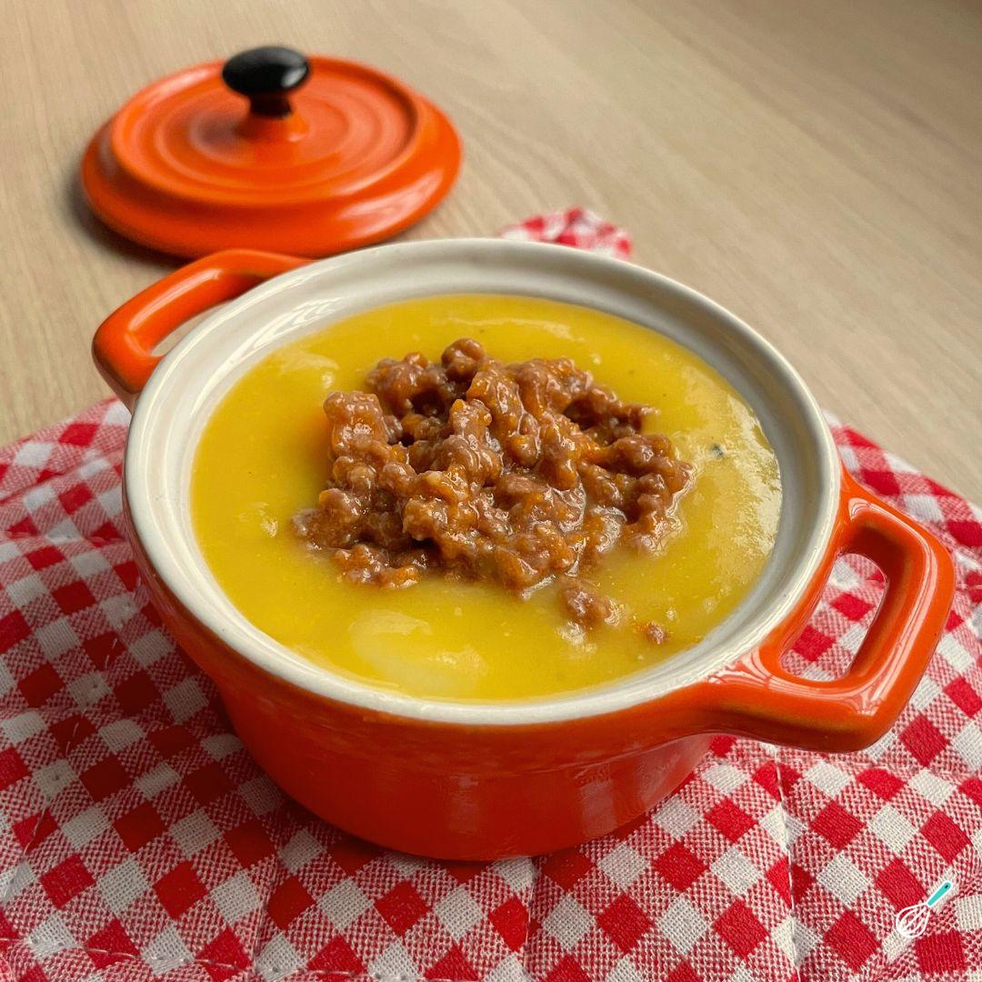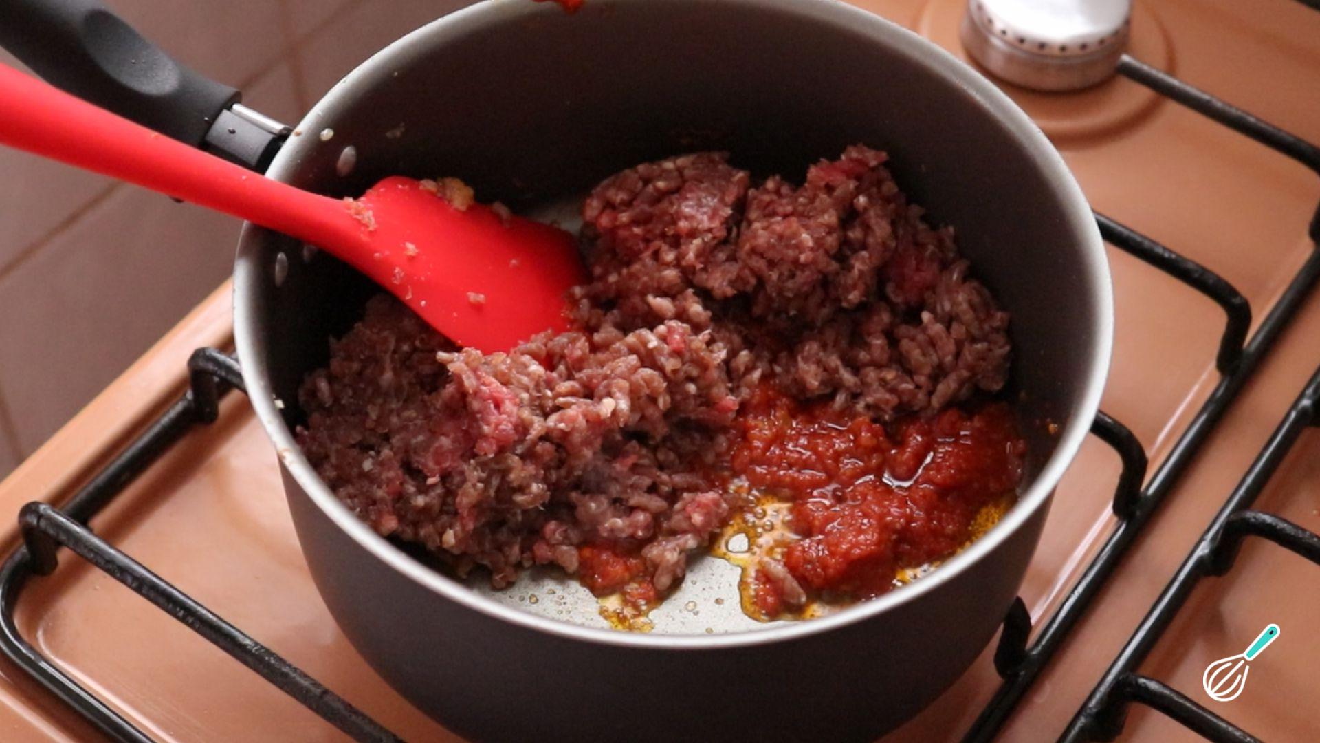 Você pode colocar alguma proteína por cima da sua Sopa na panela de pressão, nós escolhemos carne moída. Tempere a carne moída com sal e pimenta a gosto e refogue com azeite, alho e cebola.