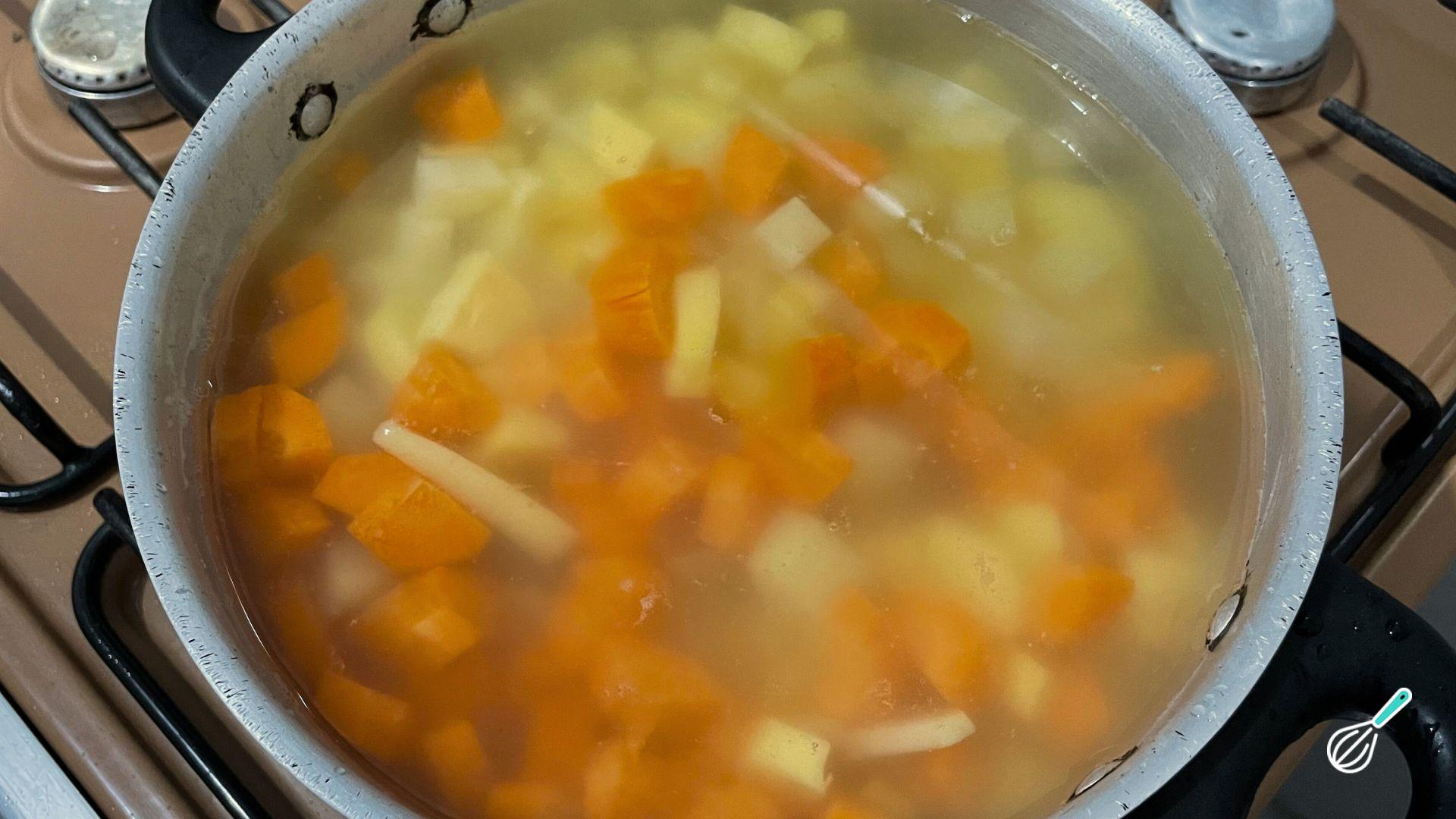 Junte a cenoura, a batata e a batata baroa em cubos, cubra com água, coloque uma pitada de sal e a folha de louro e cozinhe na panela de pressão por 15 minutos a partir do momento que a panela começar a chiar.