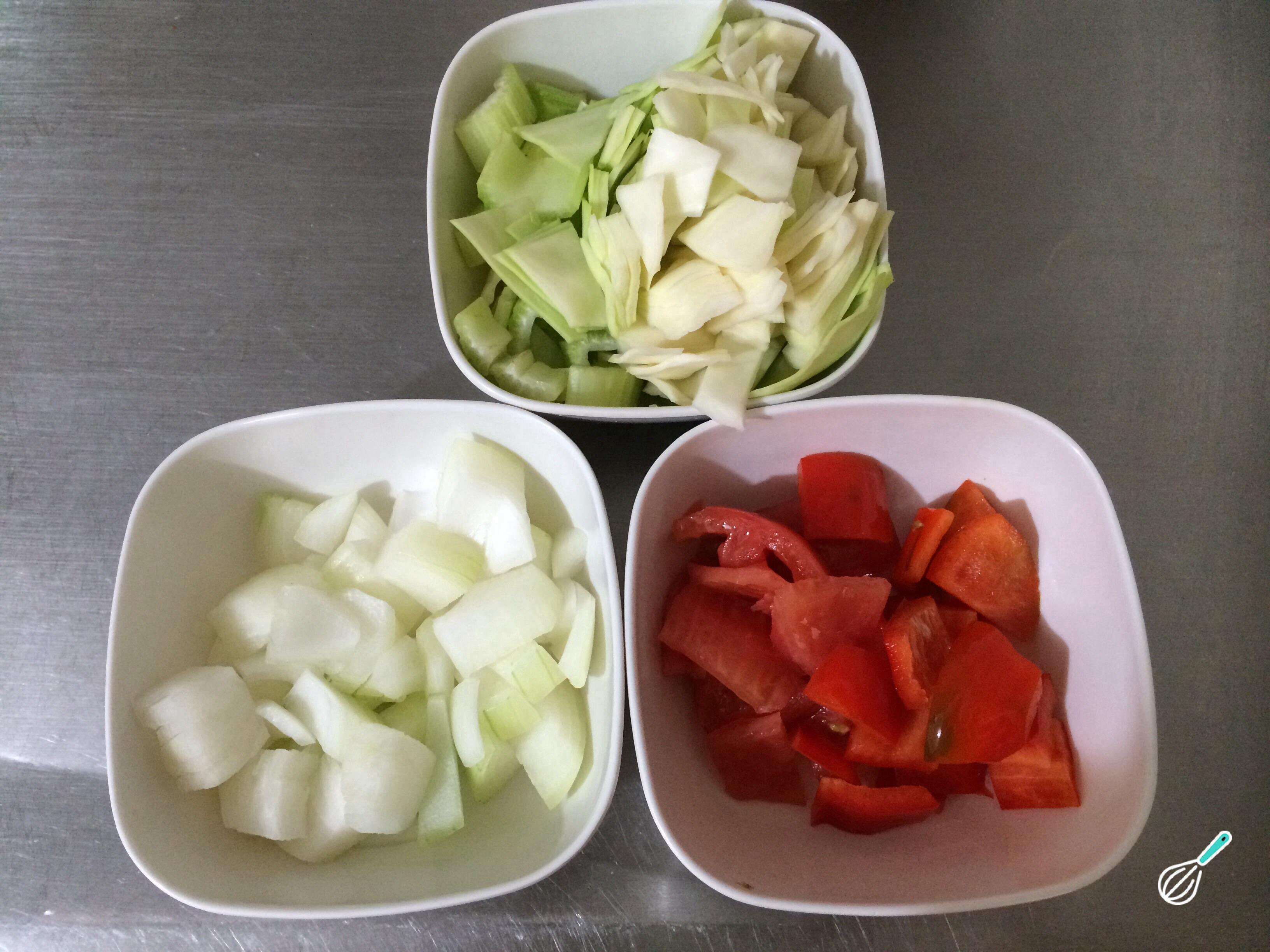 Corte os legumes em pedaços pequenos, para que cozinhem mais depressa. Retire a pele e as sementes dos tomates, assim como do pimentão.