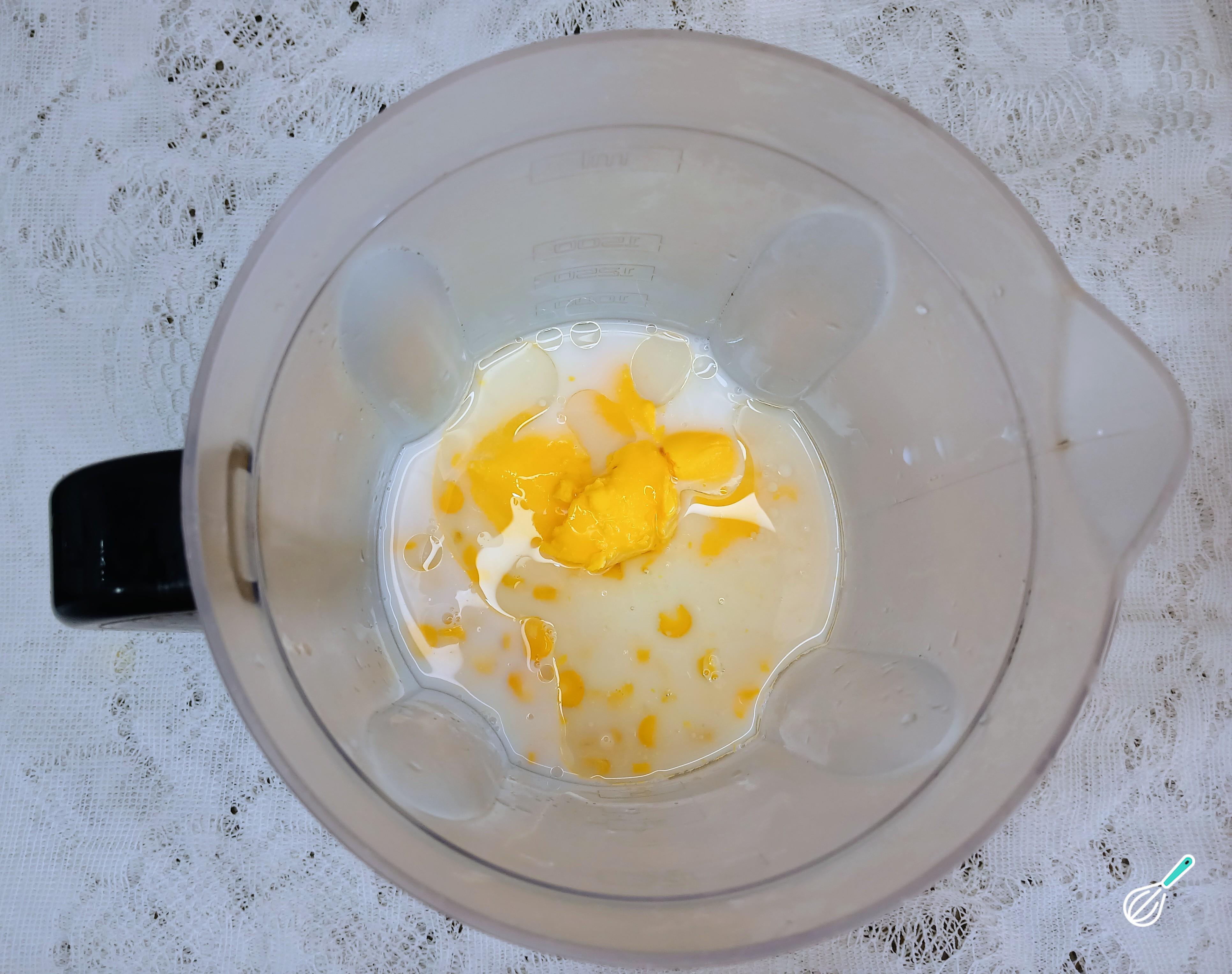 No liquidificador adicione o milho verde, os ovos, o óleo, o leite e o requeijão ou queijo tipo cheddar. Bata tudo muito bem no liquidificador até ficar homogêneo.