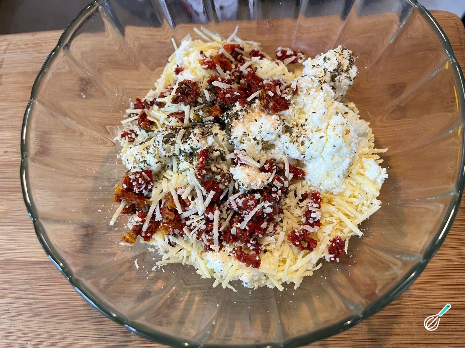 Misture a ricota com os tomates hidratados e picados, o manjericão desidratado e o queijo ralado.