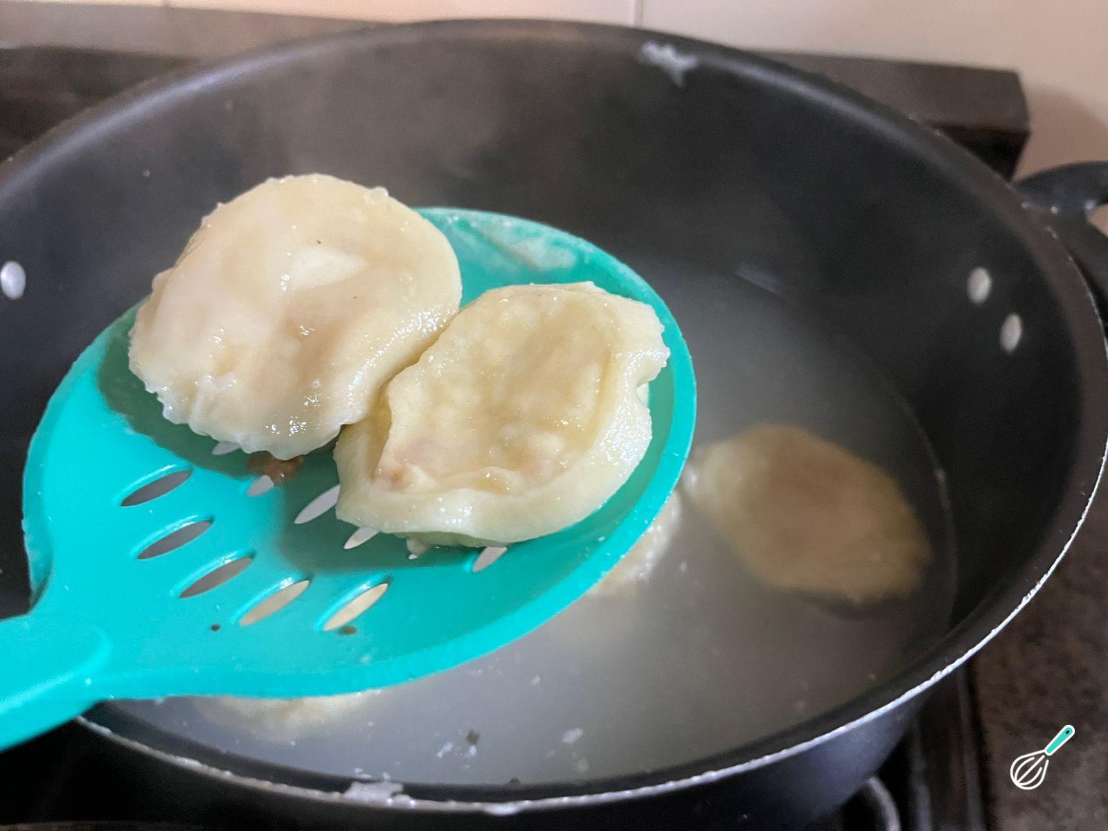 Cozinhe os sorrentinos em lotes para que eles não se sobreponham e grudem uns nos outros. Quando a água voltar a ferver e eles boiarem, espere 1 minuto e retire-os com uma escumadeira.