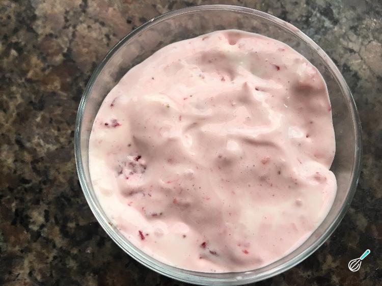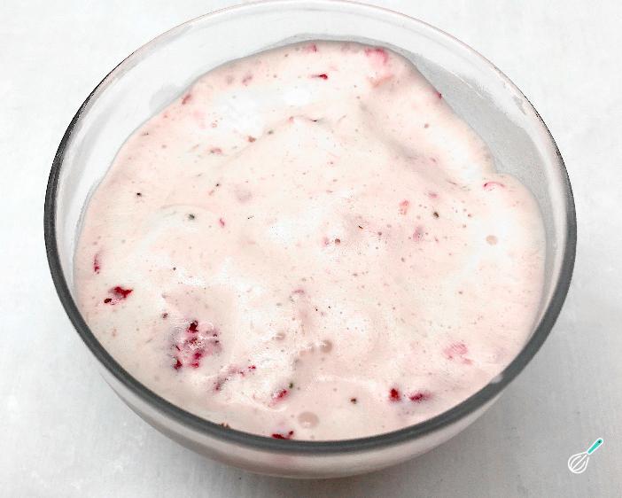 Por último, acrescente o morango e bata novamente. Coloque em taças e leve para o congelador 30 minutos.